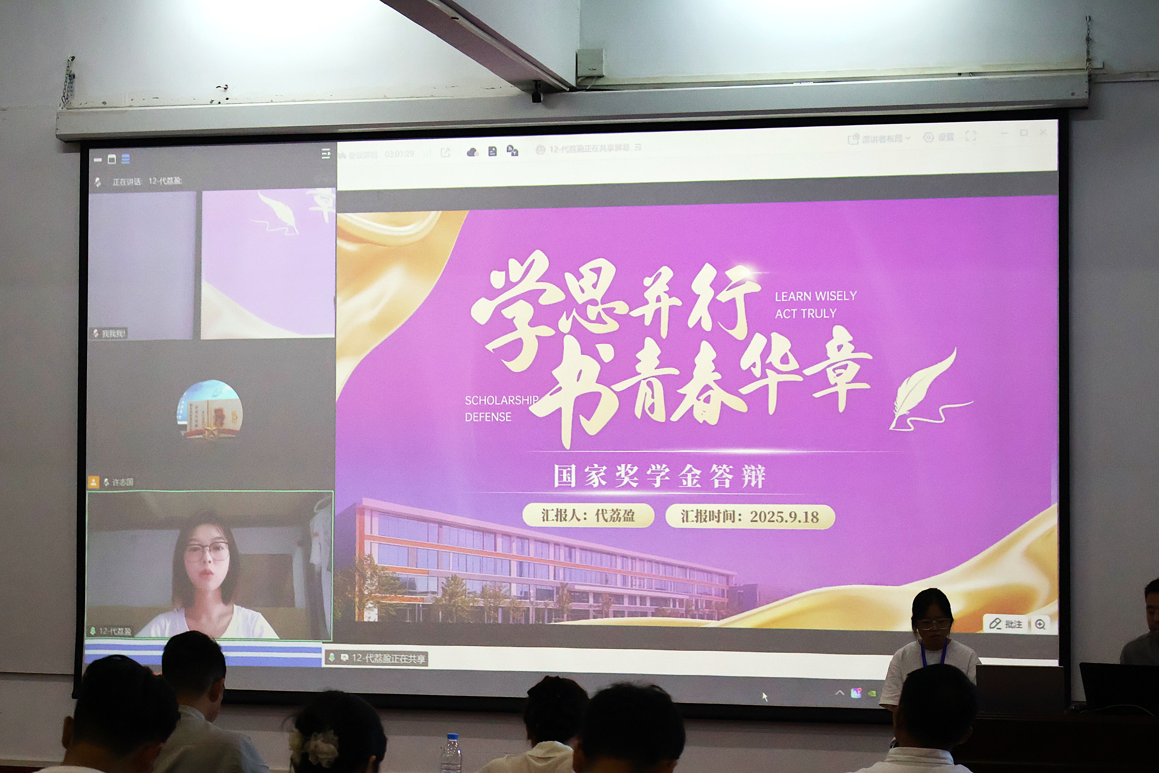 本次答辩因候选人规模分两场开展,全程执行统一规则,保障公平公正。第一场为线上专场,聚焦2022级的15名学子。他们克服距离限制,通过视频连线按抽签顺序登场,在3分钟个人陈述中,既分享专业学习的深耕成果,也讲述实践项目中的探索经历,用清晰表达传递出“实践不缺位、成长不停步”的进取态度。