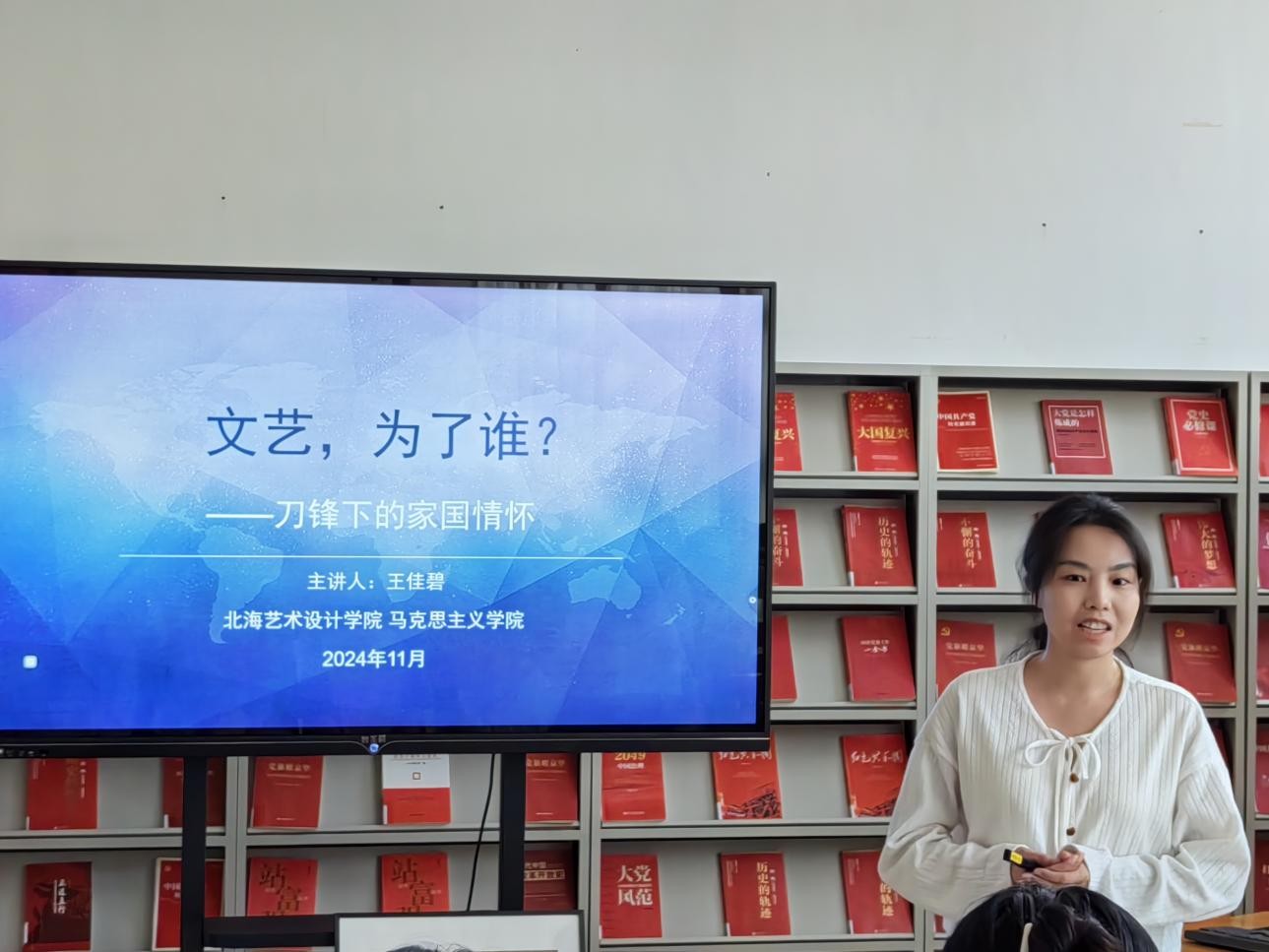 11月11日下午5:00,王佳碧老师在图书馆三楼“红色阅读角” 举办红色知识专题讲座,本期讲座的主题是文艺,为了谁?——刀锋下的家国情怀!书法学院、服装学院、人文教育学院的积极分子到场聆听讲座并参与互动,氛围良好,同学们纷纷表示受益匪浅。(张家梅摄)