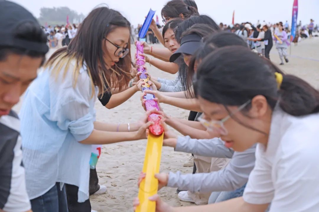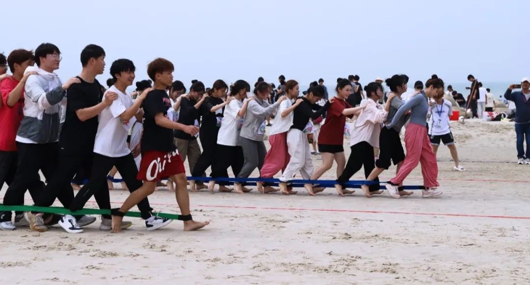 此次运动会共设沙滩排球、同舟共济、巨人脚步、水到渠成、袋鼠跳等五个竞赛项目,这些特色比赛项目以集体形式竞赛,强调团队协作和相互帮助。比赛现场,海浪声伴着热烈的加油声和欢笑声,同学们在集体运动中感受团队精神,增进友谊,收获快乐。沙雕比赛中,同学们尽情发挥创造力,大胆创新,以铁锹为刻刀,将纸上的设计图稿用细软白沙慢慢堆砌雕琢成型,一座座雕塑既有写实的雕刻,又有活泼的创意,同学们用生动的沙雕作品展现着他们对美的追求。
