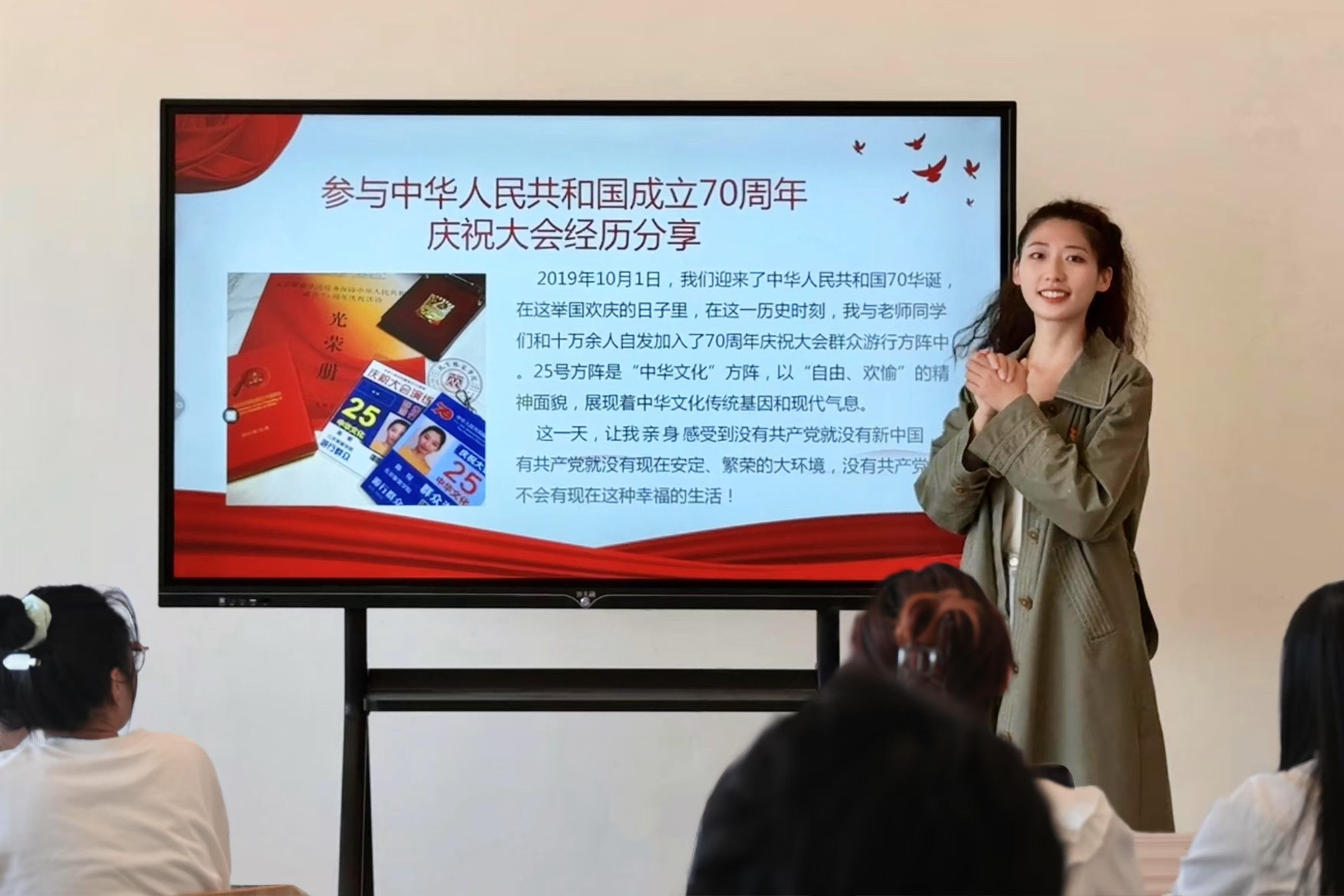 服装学院团总支书记陈琛以“手绘日记”抒发“爱国情怀”,激励青年大学生积极投身于“同心共筑中国梦”的伟大实践中。她详细阐述了中华人民共和国成立70周年庆祝大会上的盛况,并讲述数十万人为此默默奉献、辛勤付出的幕后故事。通过她生动而精彩的讲述,大家仿佛置身其中,深刻领悟到“此生无悔入华夏,来生愿在种花家”这一表述的深层内涵。她强调,作为新时代的青年马克思主义者,大家要做到坚定理想信念,筑牢思想根基;不忘初心、牢记使命;勇于担当,积极投身实践;创新进取,引领时代潮流;为实现中华民族伟大复兴的中国梦而奋斗。
