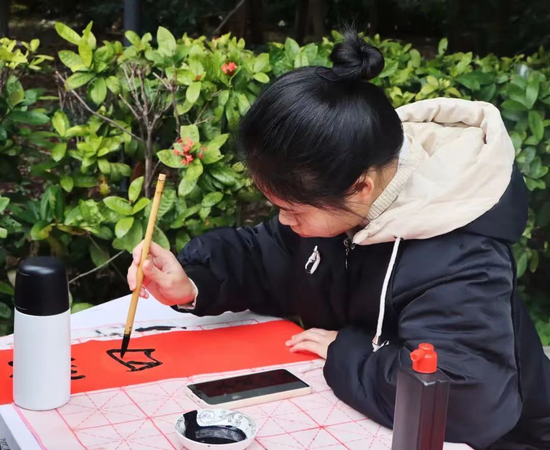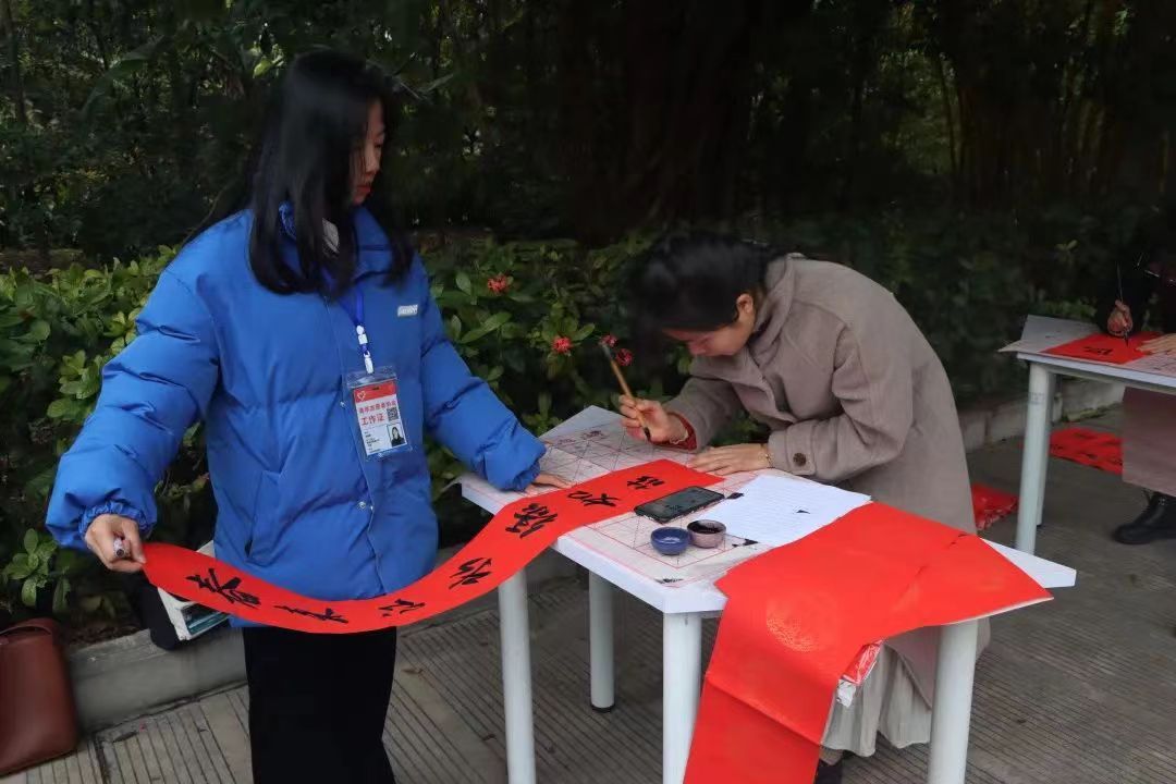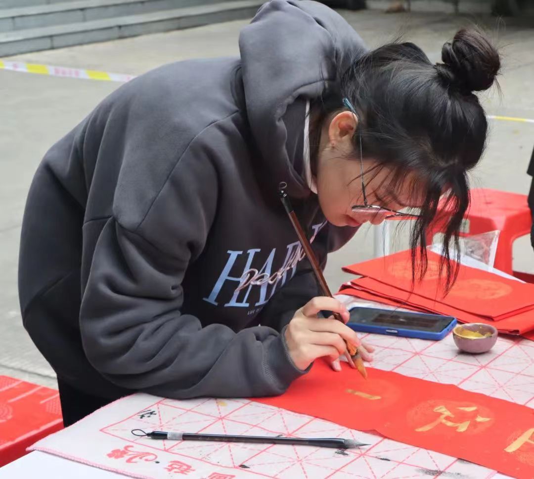 小书法家们神情专注,一幅幅行书、隶书、楷书春联各具特色,吸引了许多老师和同学前来欣赏,不少春联、“福”字墨迹未干就已被收入囊中,现场气氛热烈。