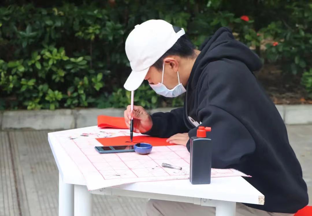 本次活动是由招募的志愿者人员进行现场书写春联,在寒风凛冽中每位志愿者紧握手中灼热的笔杆书写出对美好未来的憧憬与期盼。志愿者一起挥毫泼墨,用或丰实厚重,或飘逸潇洒的笔触,满怀热情地写下一幅幅饱含美好祝福的春联。正所谓无联不成春,有联春更浓,他们挥毫笔墨、走笔游龙,笔尖点缀着人间烟火气息,赢得在场学生阵阵赞誉。“爆竹四起接五福,梅花一枝报三春”、“福如旭日腾云起,财似春潮乘风来”、“国泰民安逢盛世,风调雨顺颂华年”一幅幅春联里都承载着新春最诚挚的祝福。