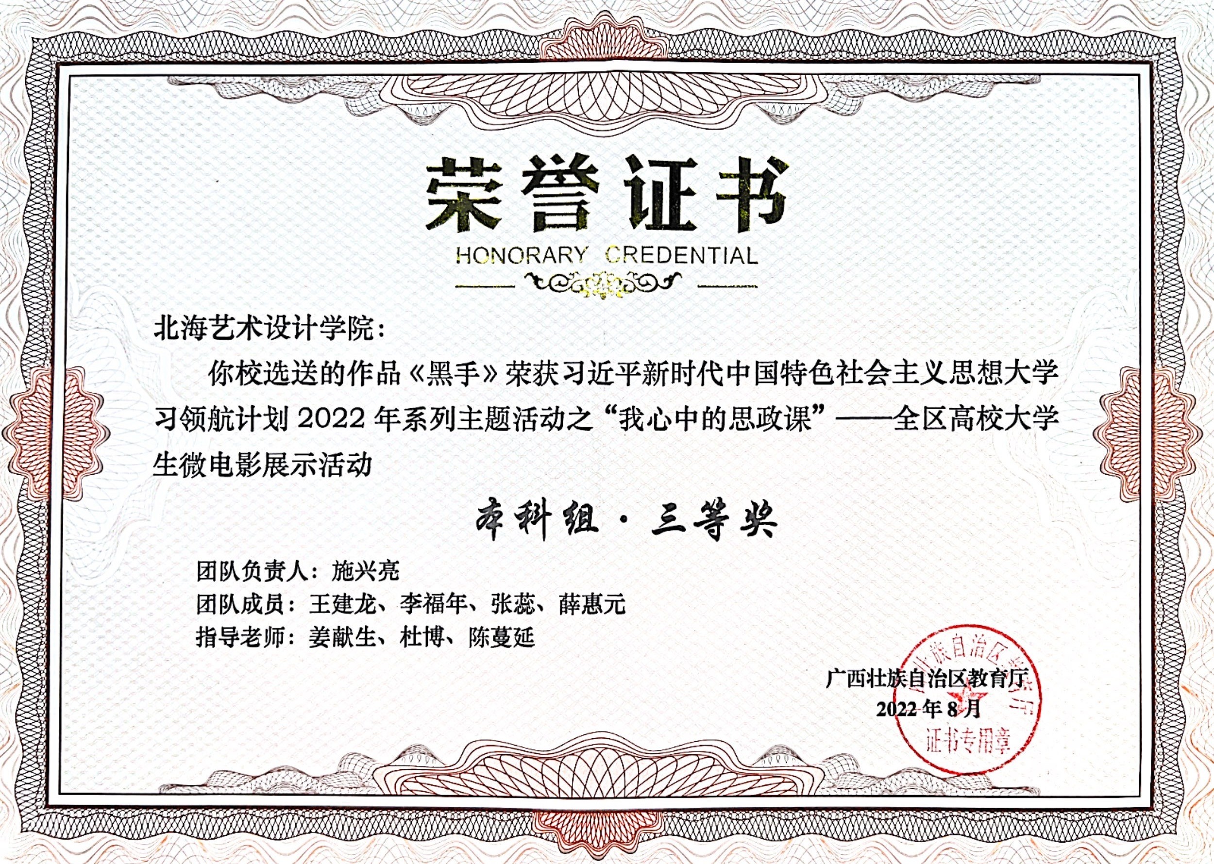 喜报:我校选送的作品《黑手》荣获习近平新时代中国特色社会主义思想大学习领航计划2022年系列主题活动之“我心中的思政课”--全区高校大学生微电影展示活动本科组三等奖