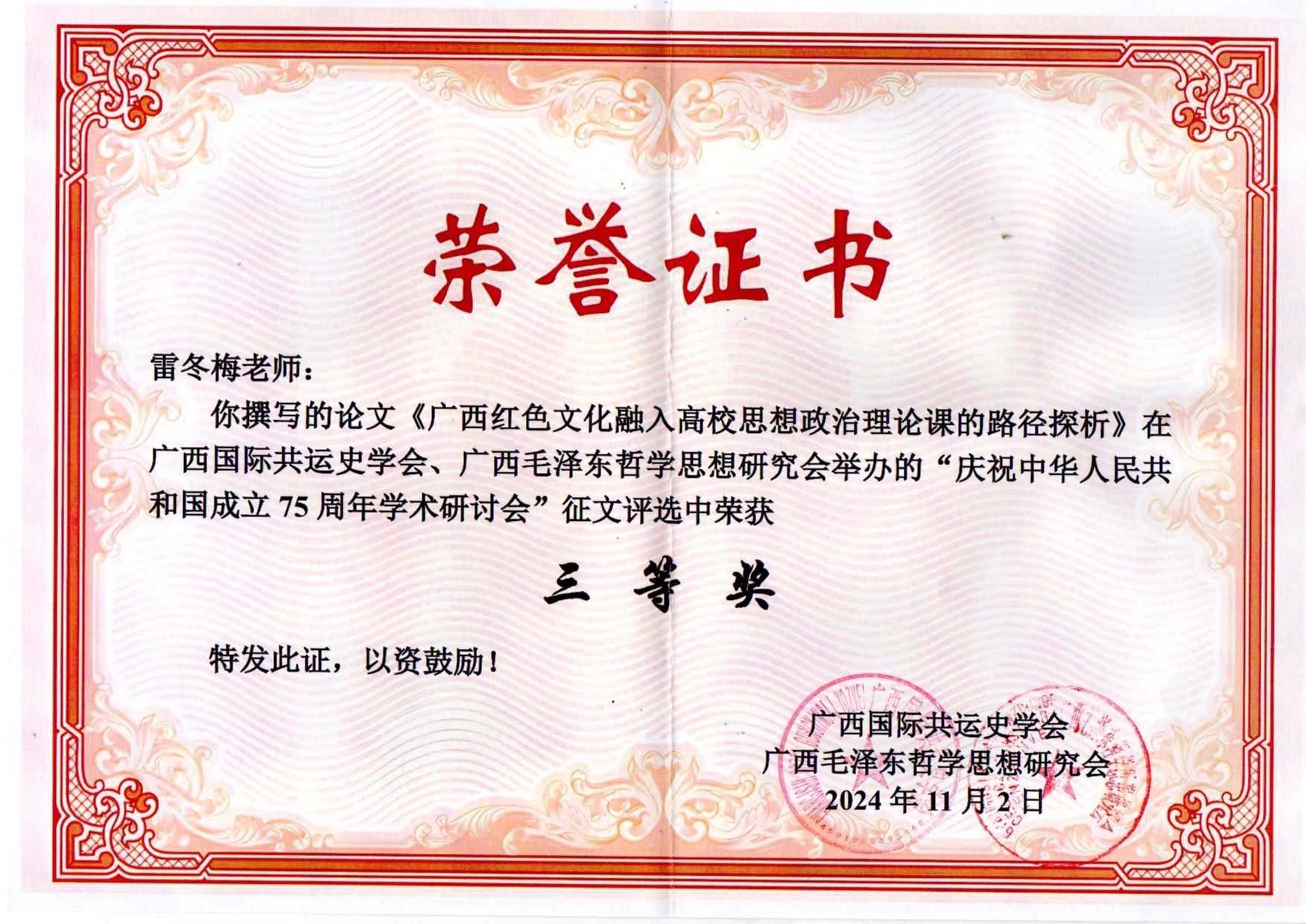 喜报:我院教师雷冬梅撰写的论文《广西红色文化融入高校思想政治理论课的路径探析》在 广西国际共运史学会、广西毛泽东哲学思想研究会举办的“庆祝中华人民共 和国成立75周年学术研讨会”征文评选中荣获三等奖