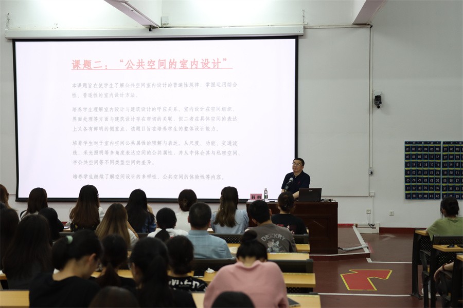 紧接着,苏丹教授围绕课程实践详细展开介绍了两个课题:一是“未来人居微环境室内设计”,旨在训练学生内部空间组织、内部环境氛围营造能力,综合考虑艺术与技术、未来与当下、物质与精神等方面要求。苏教授表示,在设计时要重点考虑内部空间的设计,考虑家具、材料的变化,特殊空间、环境的变化。他希望大家能用空间组合的方式去解决空间问题,充分发挥想象力,打开格局,通过多细节去完成构想。二是“公共空间的室内设计”,引导学生了解公共空间室内设计的普遍性规律,掌握运用综合性、普适性的室内设计方法。苏教授强调,方法上要侧重于小尺度的细节、选材的把控,他认为在设计过程中,建筑理念的变化应渗透到整个空间,大家需要通过许多实践性的调研来帮助完成作品,以此培养理解室内设计与建筑设计的呼应关系的能力。