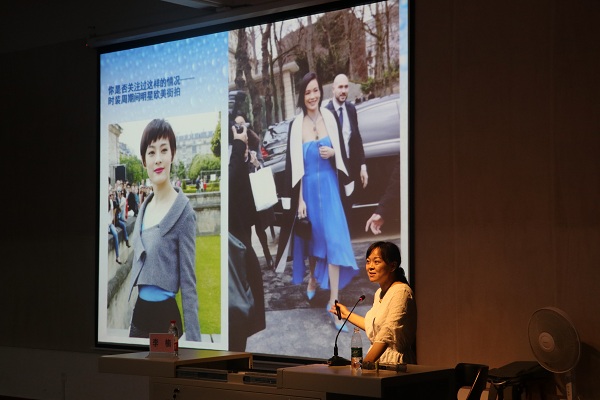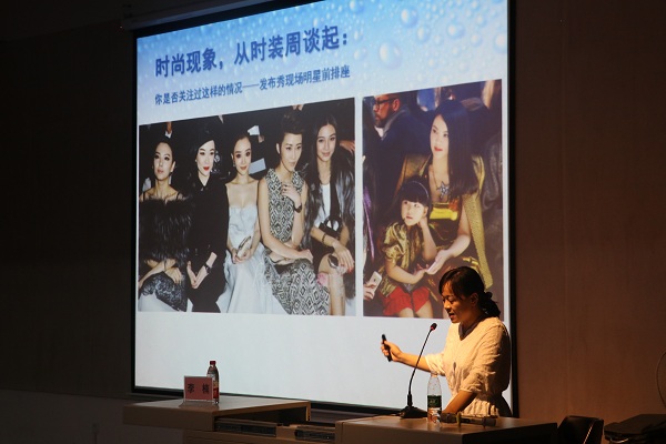 讲座开始,李楠老师首先从时尚现象、服装周谈起,向同学们展示了时装发布会现场前排明星服饰、时装周期间明星街拍服装以及电影节红毯明星争奇斗艳的服饰,说明现在人们对中外明星的关注越来越聚焦于服饰。