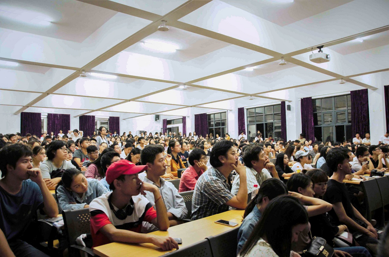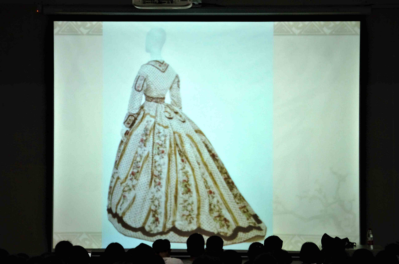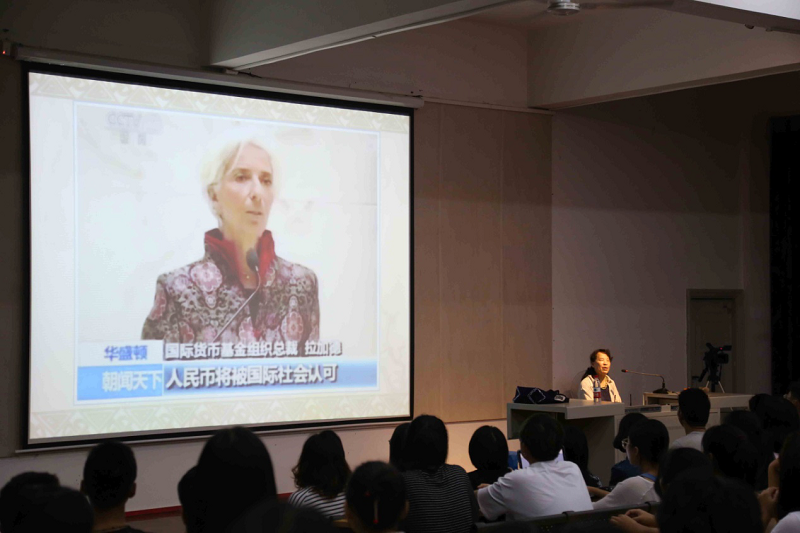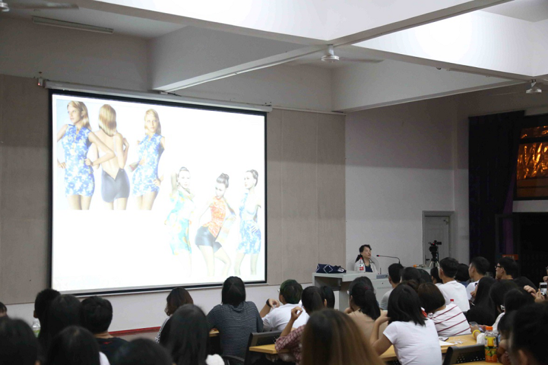 讲座开始,徐教授亮出国际货币基金组织总裁拉加德身穿旗袍的图片,她指出不仅人民币被国际社会认可,中国的传统服饰也将被世界所认可,以小见大引出中国服饰之美,引起了现场同学们浓烈的听讲兴趣。