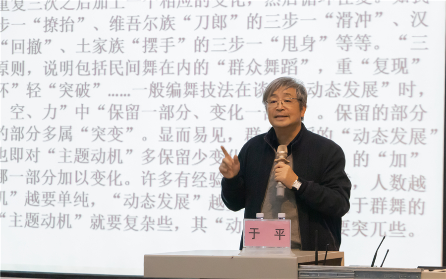 随后,于教授结合自己的编舞实践,深入讲解了群舞编创中需要注意的三个要点:以“三步加”为基础的动态展开编舞,通过“线性流动”编创舞蹈的“视觉式样”,编创中注意“群舞织体”的关系及其“等重平衡”的构图。于教授指出,我们要学会从生活中提炼“主题动机”,注意生活表现的“典型性”和舞台表现的“可舞性”,再运用上述要点进行舞蹈编创,就能创作出优秀的作品。