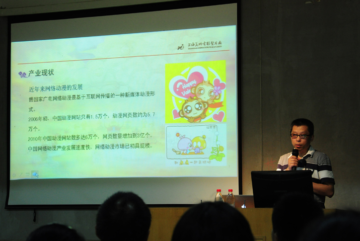 在讲座中,朱教授首先介绍了国家对于动漫产业的政策,通过近三年来的动漫产业产值规模等数据分析,详细地阐释了我国动漫产业的现状。然后分别以美国(迪士尼模式、梦工厂模式)、日本(东映模式、万代模式)、韩国等国家的动漫产业发展轨迹及模式为例,分析了国际动漫产业的发展现状及对中国动漫产业的影响,提出了他本人对于中国动漫产业的问题与思考。朱教授还介绍了上海美术电影制片厂的基本情况和该厂制作的一系列经典动画片,同学们通过观看《勇士》、《马兰花》的制作花絮,了解了这两部优秀国产动画影片的动画制作、音乐制作、配音等各方面的情况。另外,朱教授还给大家介绍了《大闹天宫3D》的制作工艺,并跟大家分享了该片在美国好莱坞制作的一些图片资料。