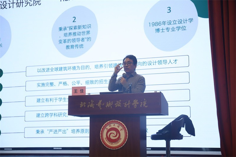 紧接着,王佳教授以近期广州设计周为案例,表明了无论从事哪个方向设计都应讲究问题本身,对待设计要实事求是,针对问题切入设计视角,同时要思考运用哪种设计方法才能解决当今社会难题。他表示,设计要遵循整体系统性,从系统角度出发,为使用者解决在实际使用过程中可能会遇到的难题。
