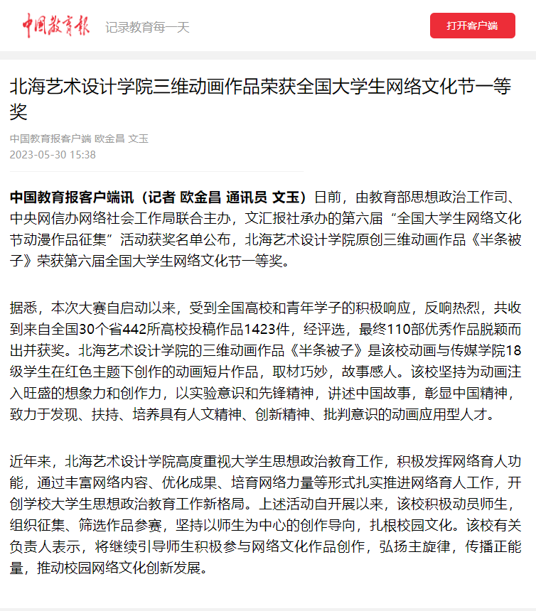 中国教育报:北海艺术设计学院三维动画作品荣获全国大学生网络文化节一等奖