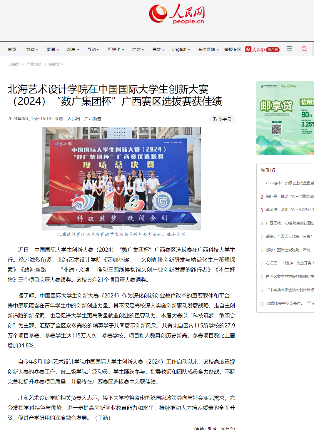 人民网:北海艺术设计学院在中国国际大学生创新大赛(2024)“数广集团杯”广西赛区选拔赛获佳绩