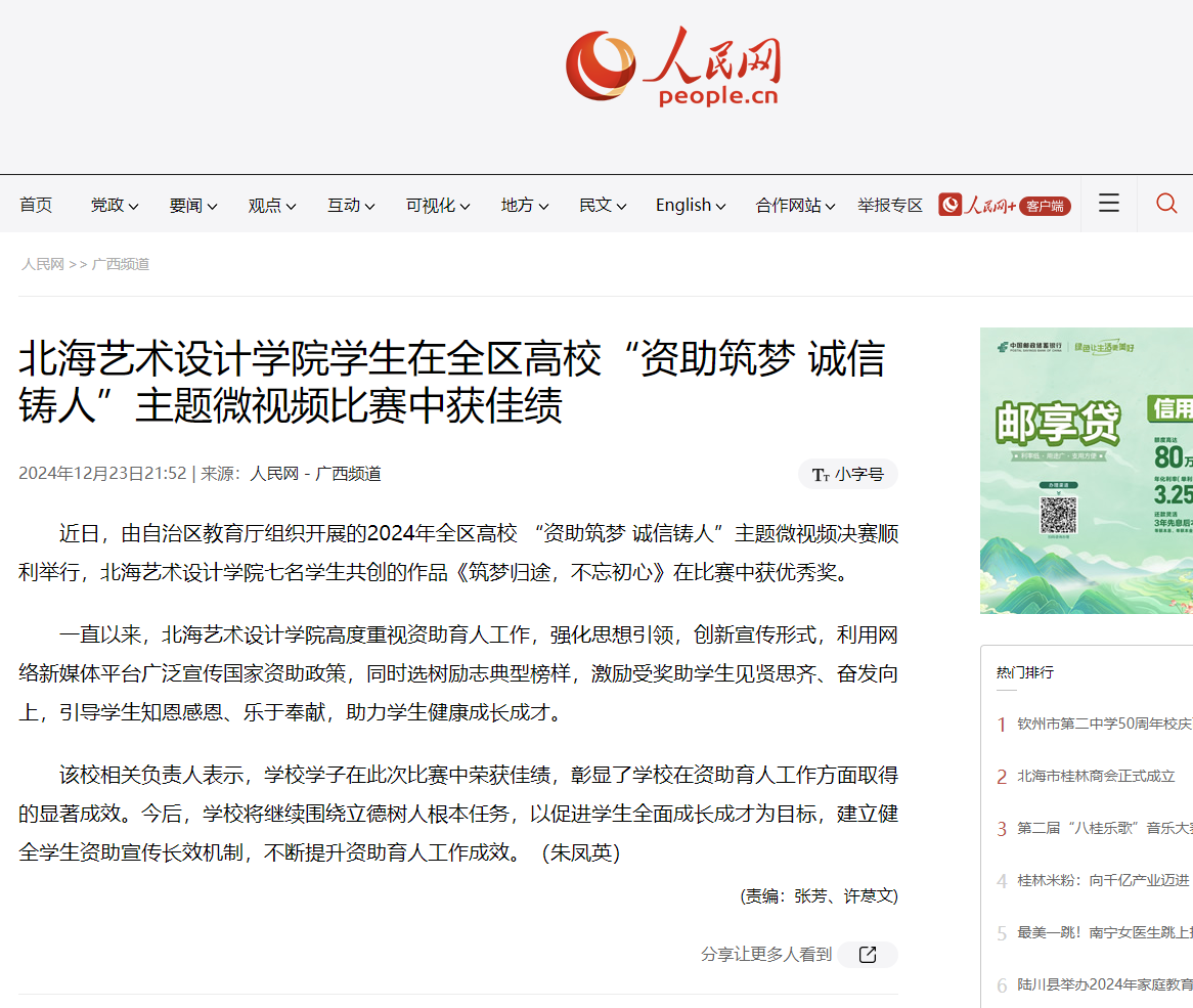 人民网:北海艺术设计学院学生在全区高校“资助筑梦 诚信铸人”主题微视频比赛中获佳绩
