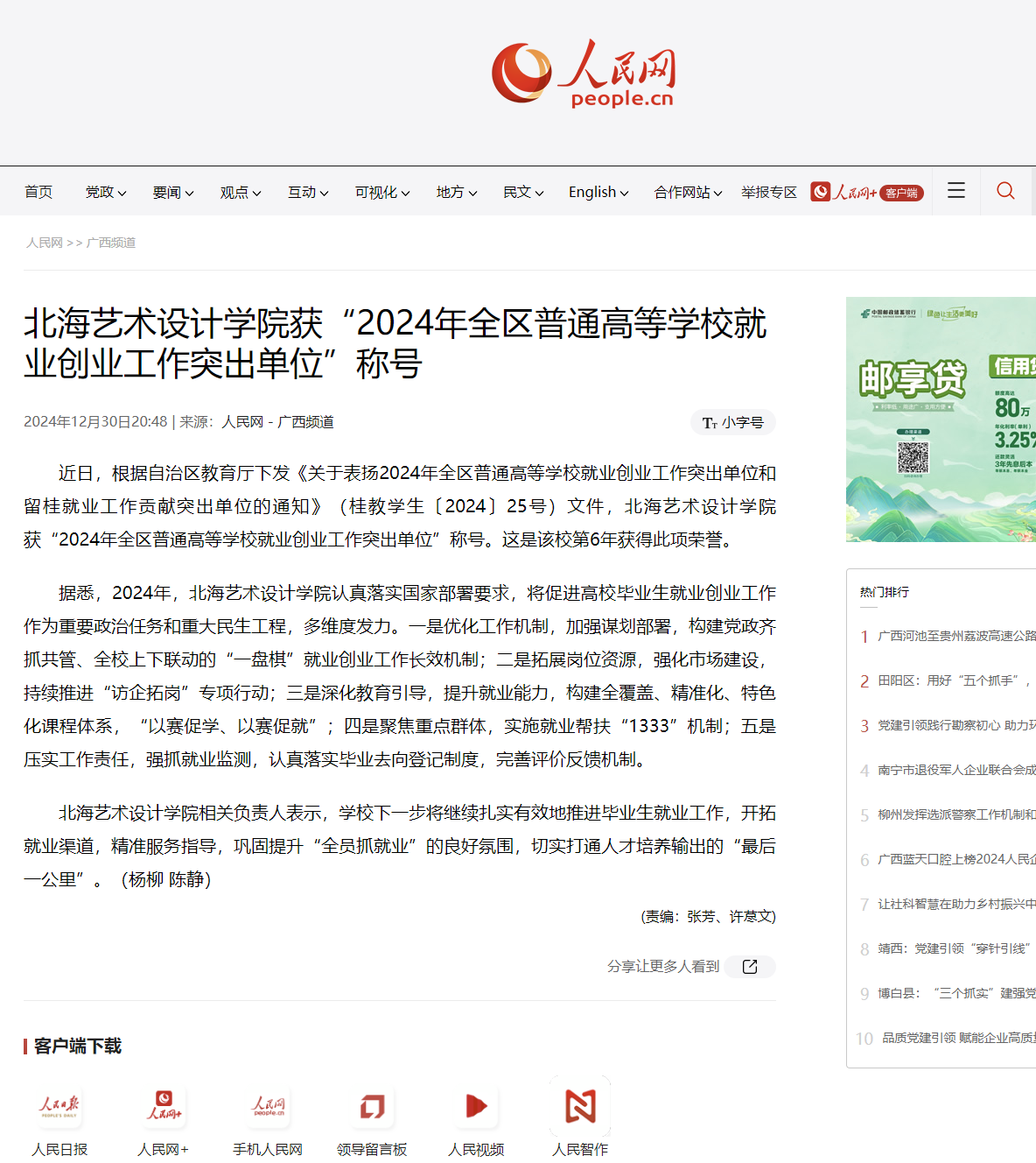 人民网:北海艺术设计学院获“2024年全区普通高等学校就业创业工作突出单位”称号