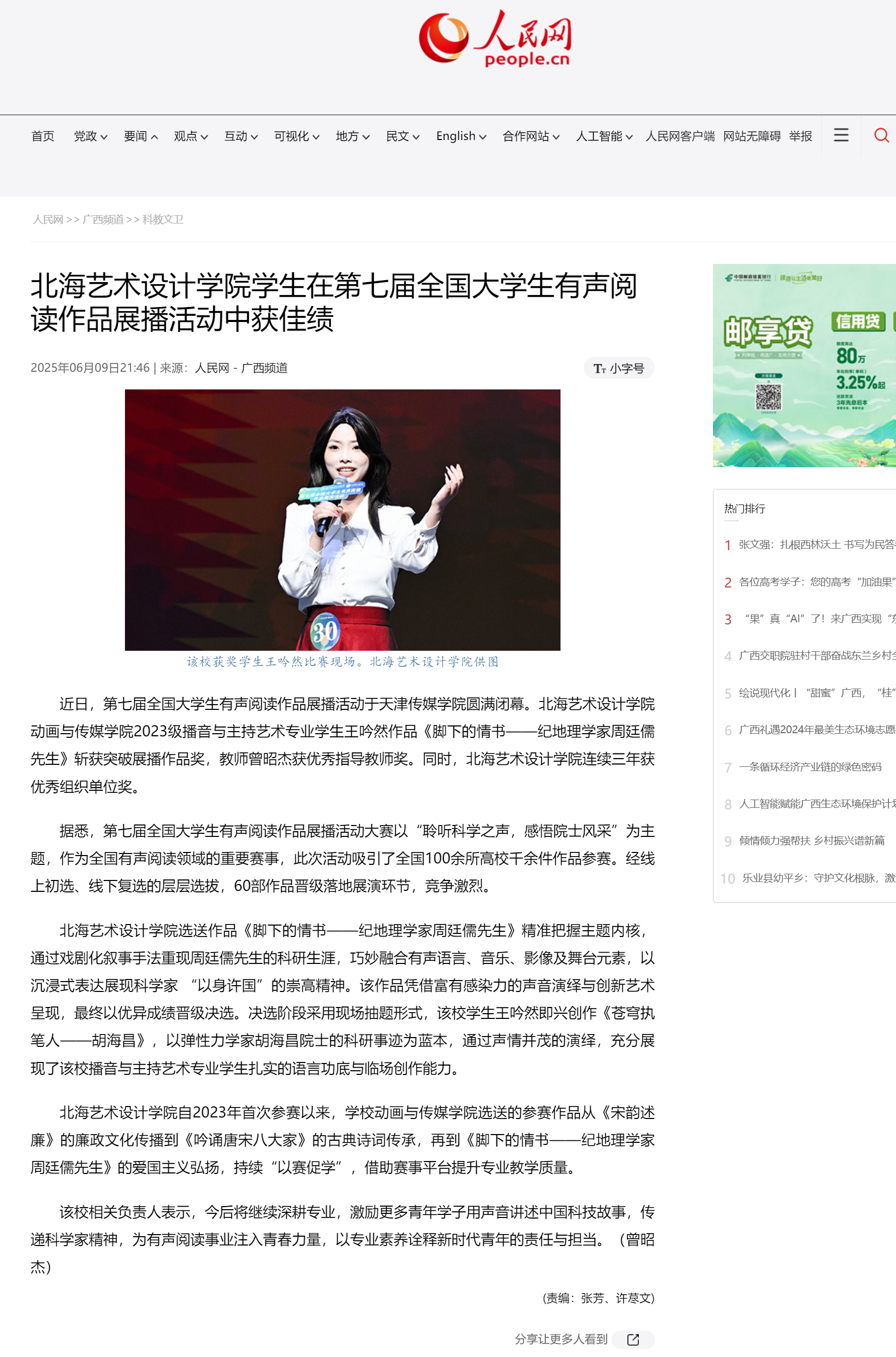 人民网:北海艺术设计学院学生在第七届全国大学生有声阅读作品展播活动中获佳绩
