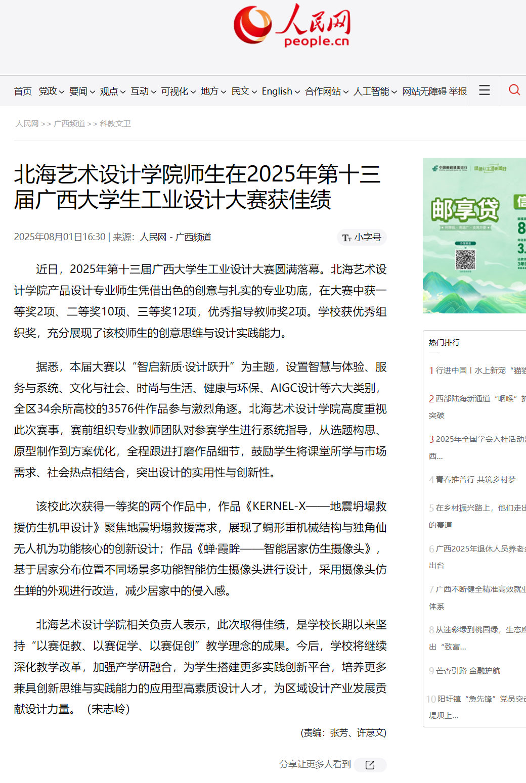人民网:北海艺术设计学院师生在2025年第十三届广西大学生工业设计大赛获佳绩