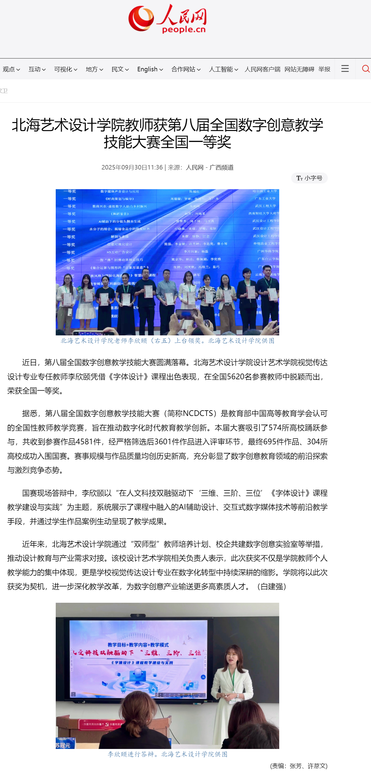 人民网:北海艺术设计学院教师获第八届全国数字创意教学技能大赛全国一等奖