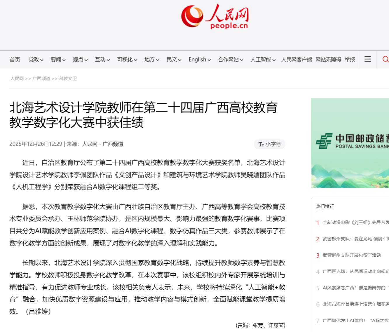人民网:北海艺术设计学院教师在第二十四届广西高校教育教学数字化大赛中获佳绩