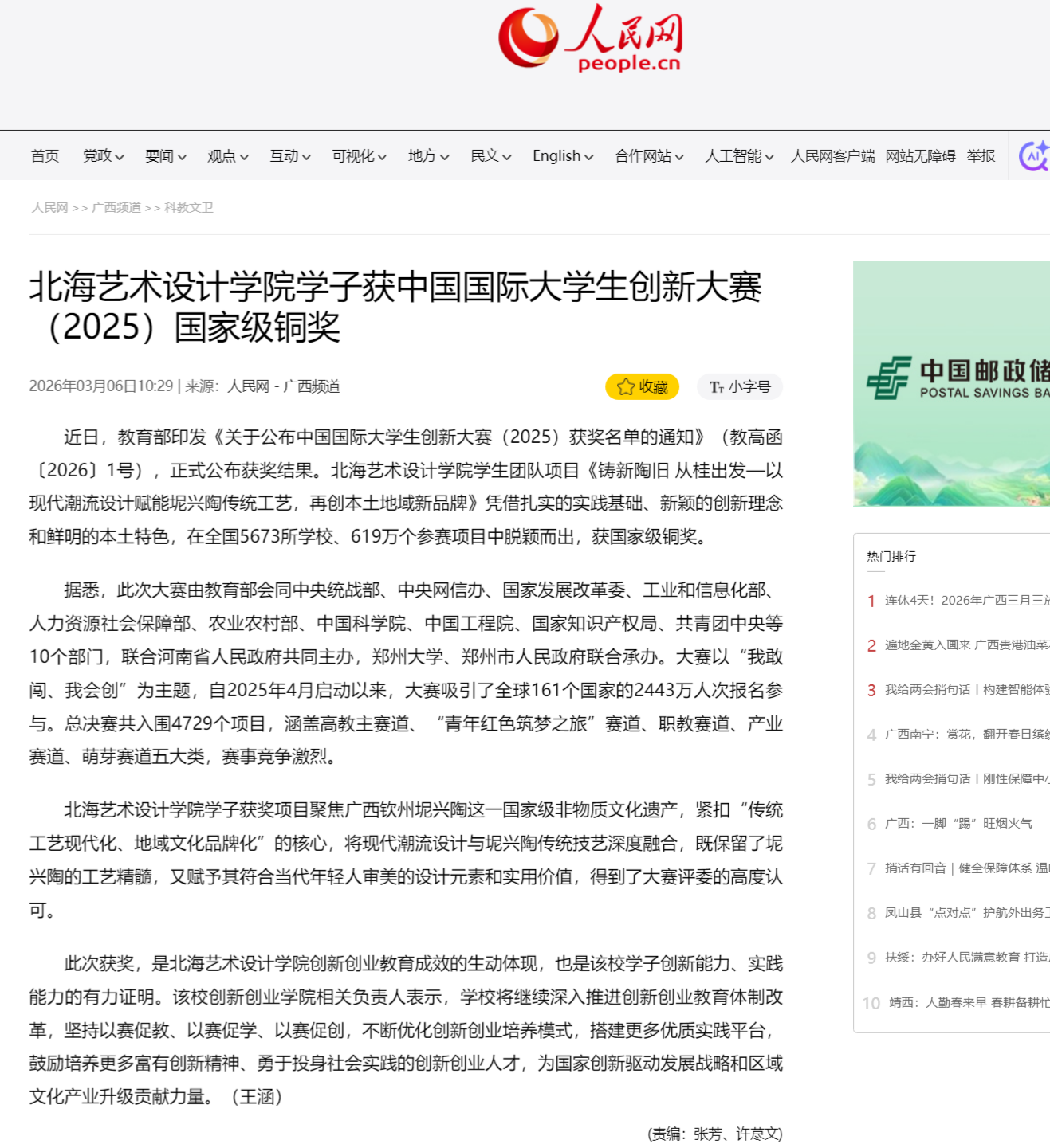人民网:北海艺术设计学院学子获中国国际大学生创新大赛(2025)国家级铜奖