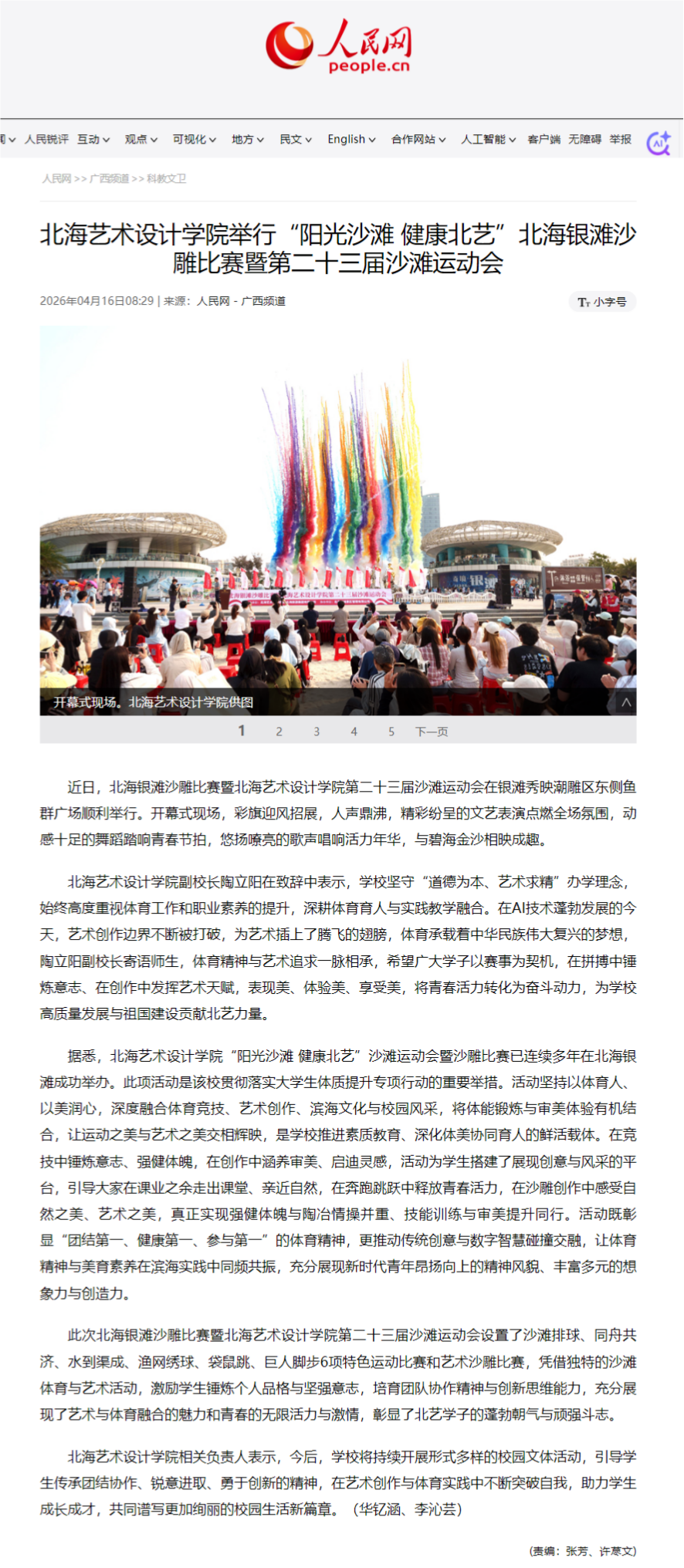 人民网:北海艺术设计学院举行“阳光沙滩 健康北艺”北海银滩沙雕比赛暨第二十三届沙滩运动会