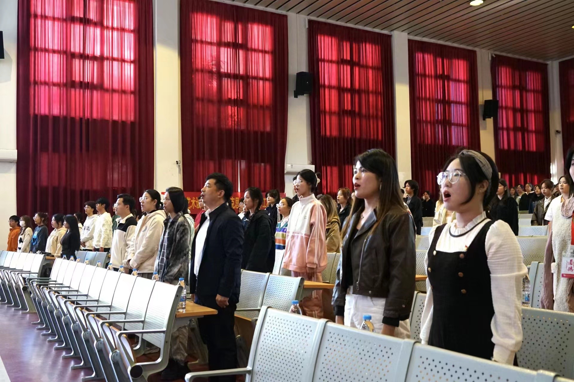 本次仪式共分为四个部分,仪式第一项,全体起立,奏唱国歌。