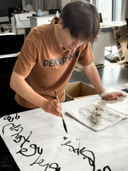 在长达七年的书法研习之路上,邓钧禧不断突破自我,实现艺术创作的蜕变。跳出惯性书写的“舒适圈”,不再机械临摹、重复技法。通过持续钻研与探索,完成了从单纯“抄字”到“悟道”的跨越。在他看来,书法不仅是技法的锤炼,更是一场终身修行。凭借对艺术本真的执着追求,邓钧禧在传承传统笔墨韵味的同时,融入当下审美,让书法作品既有古典意趣,又具时代气息。(盛可欣 贺梦真 摄)