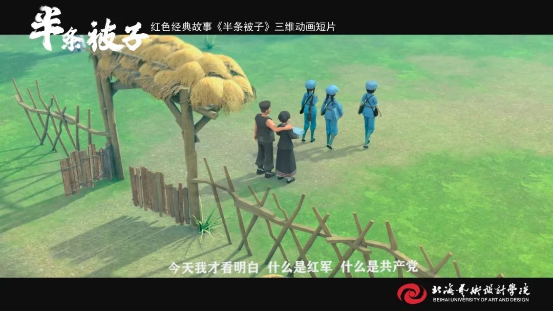 《半条被子》师生创作团队 《半条被子》是我校动画与传媒学院18级在校学生在“建党百年”命题下制作的动画短片作品,取材于纪念红军长征胜利80周年大会上,习近平总书记讲述了82年前发生在湖南汝城县的“半条被子”的感人故事。3名女红军借宿在湖南汝城县沙洲村村民徐解秀家临走时,将自己仅有的一床被子剪下一半送给老人。什么是共产党?共产党就是自己有一条被子,也要剪下半条给老百姓的人。