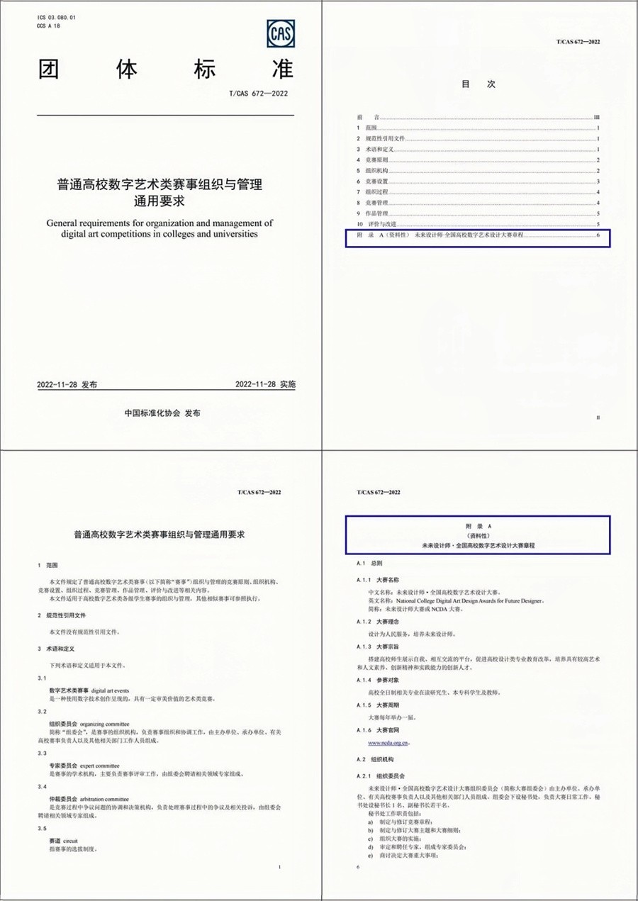 近日,由未来设计师·全国高校数字艺术设计大赛(以下简称为未来设计师NCDA大赛)组委会和中国计量大学联合发起,中国美术学院、华东师范大学、江南大学、重庆交通大学、北海艺术设计学院等14所高校参与研制的《普通高校数字艺术类赛事组织与管理通用要求》(标准号T/CAS672—2022)正式由中国标准化协会(CAS)发布。