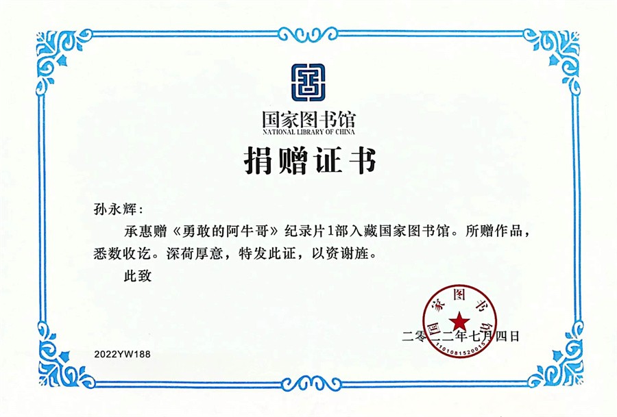 《勇敢的阿牛哥》入藏国家图书馆证书