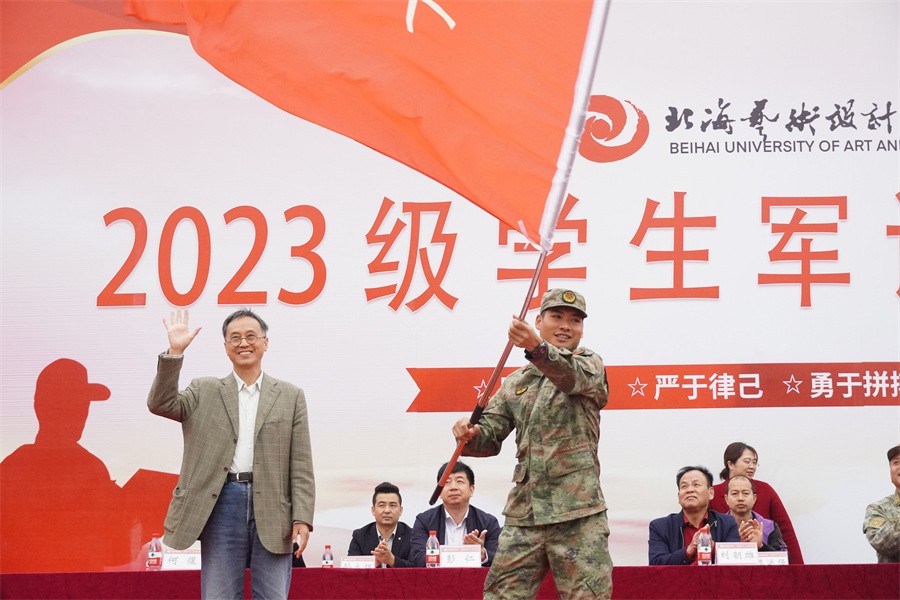 动员大会上,我校卢新华校长向北海海城区人民武装部领导授军训团团旗并宣布2023级学生军训开训。(周小琪、郭松、王弘武、周雨晨、高闻雨、相恒佳/摄)