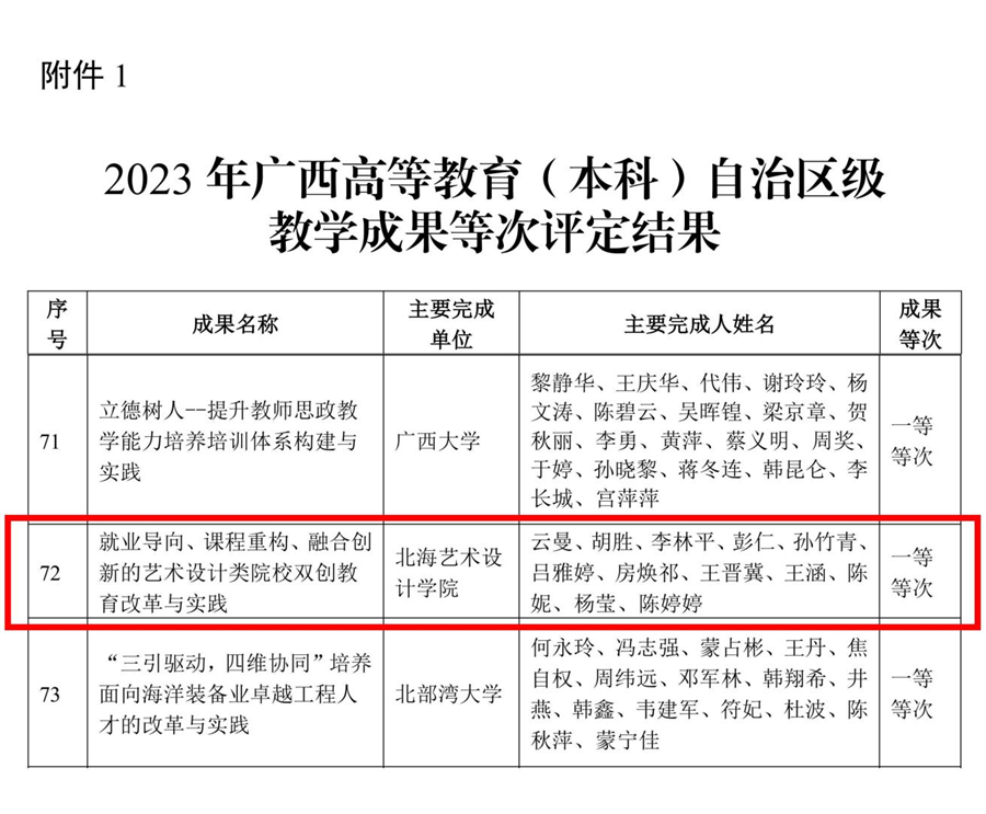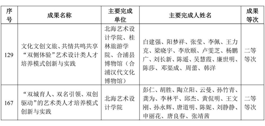 近日,自治区教育厅公布了《2023年广西高等教育自治区级教学成果等次评定结果的通知》(桂教高教〔2024〕4号)。我校在广西高等教育(本科)自治区级教学成果奖方面以第一完成单位获得一等等次1项、二等等次2项。其中,创新创业学院院长云曼主持完成的《就业导向、课程重构、融合创新的艺术设计类院校双创教育改革与实践》获评一等等次。学校彭仁教授主持完成的《“双城育人、双名引领、双创驱动”的艺术类人才培养模式创新与实践》;设计艺术学院副院长白建强主持,与桂林旅游学院和合浦县博物馆(合浦汉代文化博物馆)合作完成的《文化文创文旅、共情共鸣共享“双侧体验”艺术设计类人才培养模式创新与实践》获评二等等次。