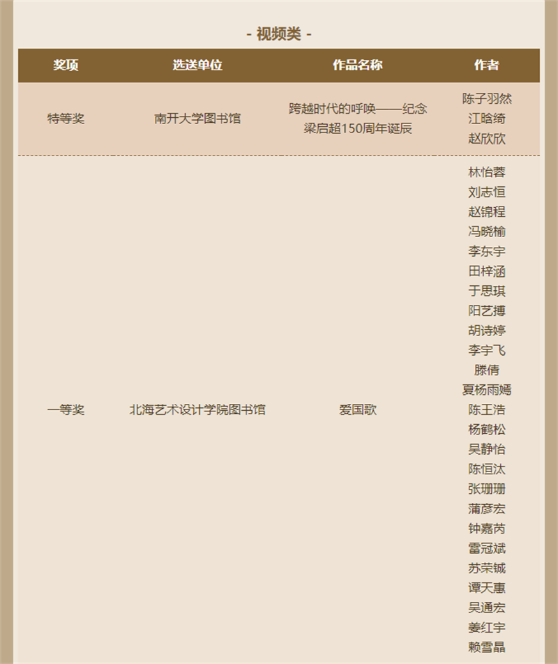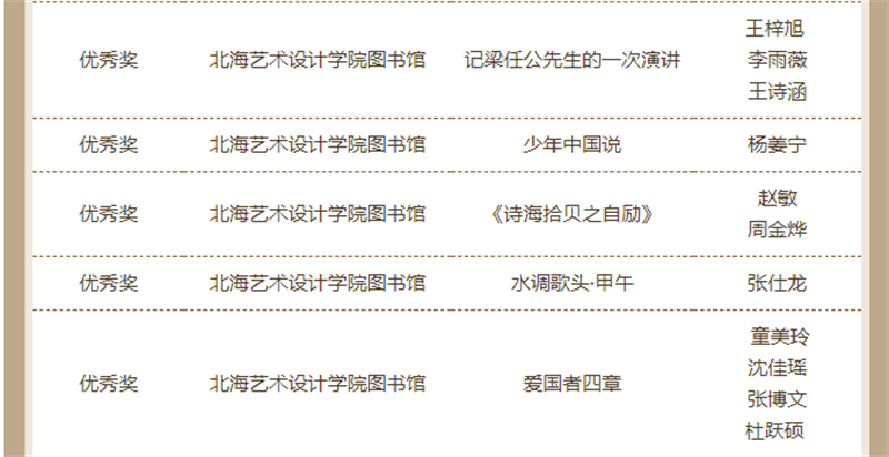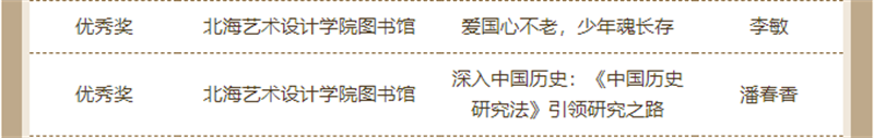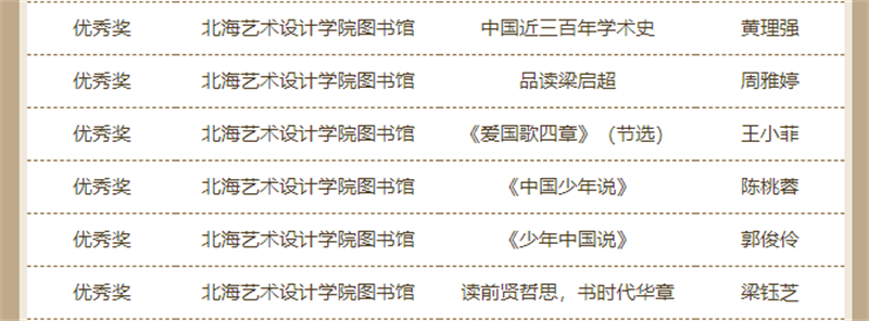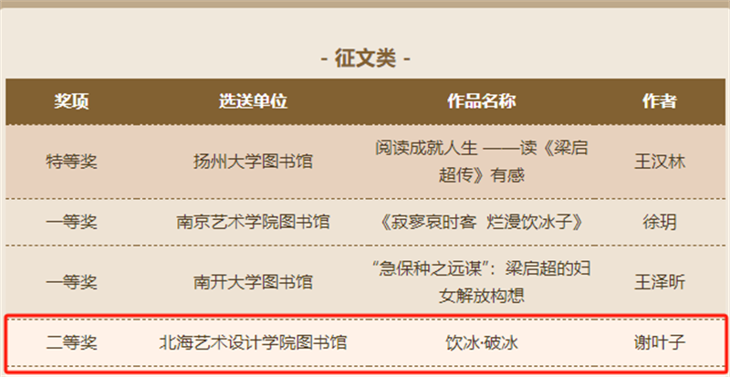 近日,由天津市全民阅读活动办公室、天津高等学校图书情报工作委员会、江苏省高等学校图书情报工作委员会主办的“品读梁启超 阅读创作大赛”的活动线上发布了获奖名单。我校学生作品征文类获得二等奖1名、优秀奖2名;书画类获得一等奖1名、三等奖2名、优秀奖6名;视频类获得一等奖1项、二等奖1项、三等奖4项、优秀奖5项。我校图书馆被评为“经典推广先进单位”“优秀组织单位奖”,学校教师喻广林、熊东等获优秀指导老师奖。