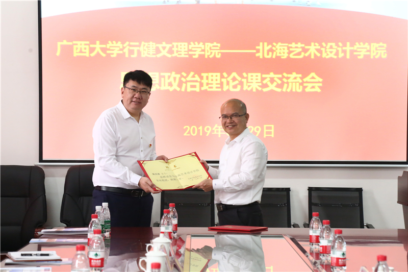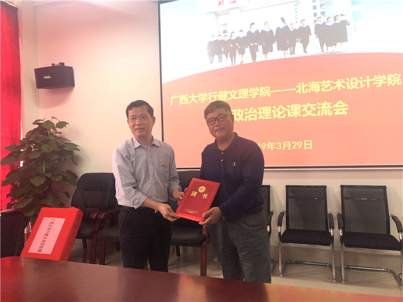 (广西大学行健文理学院党委书记徐照宏向我校思政部主任姜献生教授授予聘书)