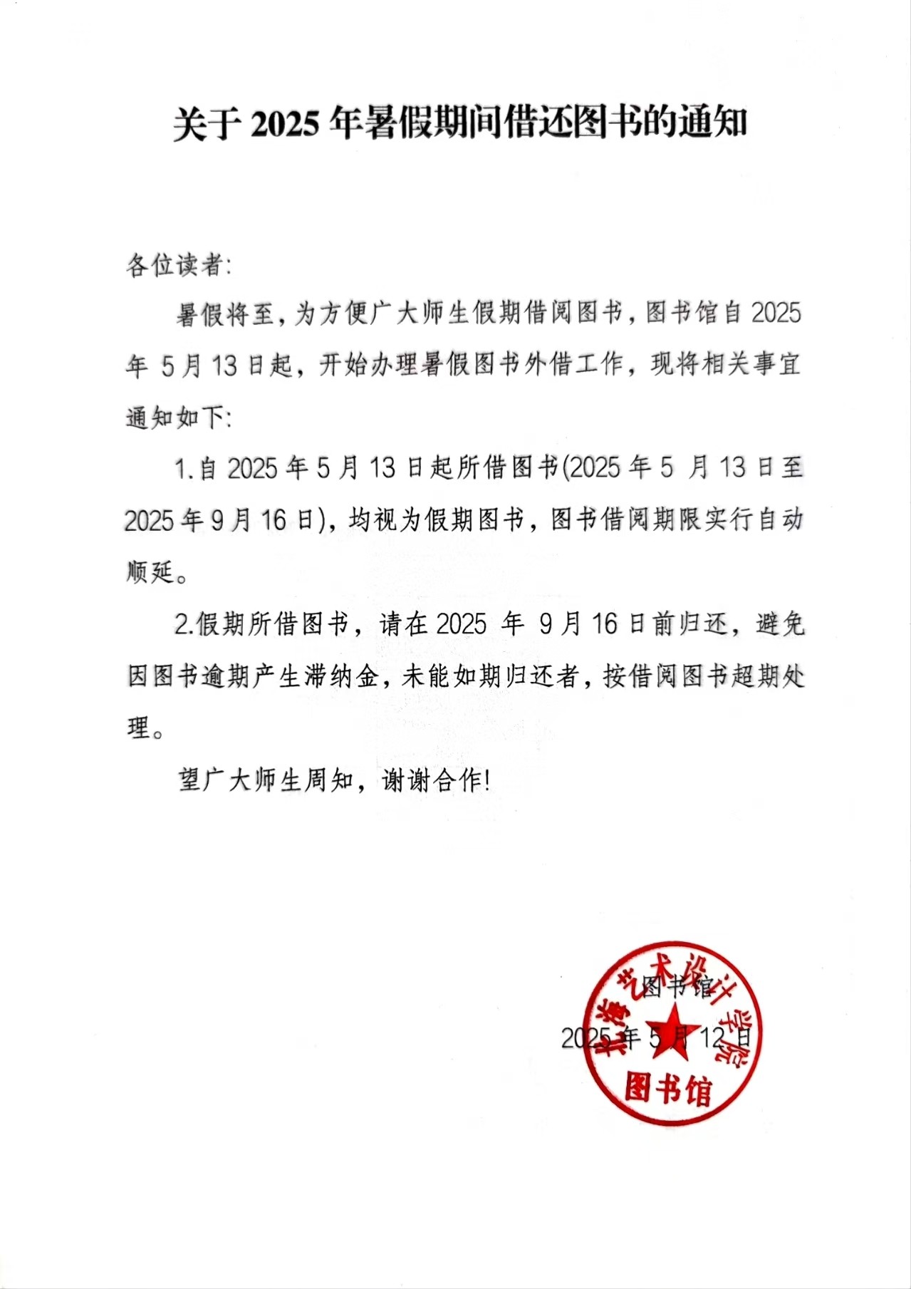 关于2025年暑假期间借还图书的通知