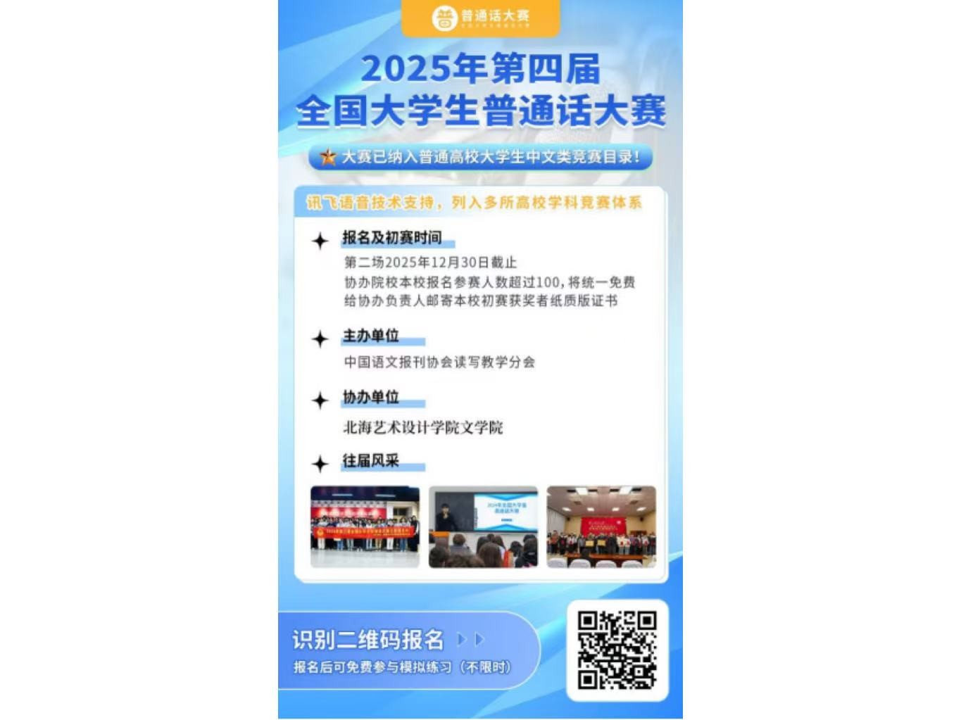 为落实中央推广普及国家通用语言文字工作的重要指示精神,中国语文报刊协会读写教学分会特面向全国高校大学生举办“2025年第四届全国大学生普通话大赛”,大赛以推广普通话为契机,进一步增强大学生的语言文字规范意识,发挥语言文字的浸润、助力作用,为铸牢中华民族共同体意识、传承弘扬中华优秀语言文化奠定坚实基础。大赛纳入《2025年普通高校大学生中文类竞赛指数目录》和众多高校竞赛榜单。
