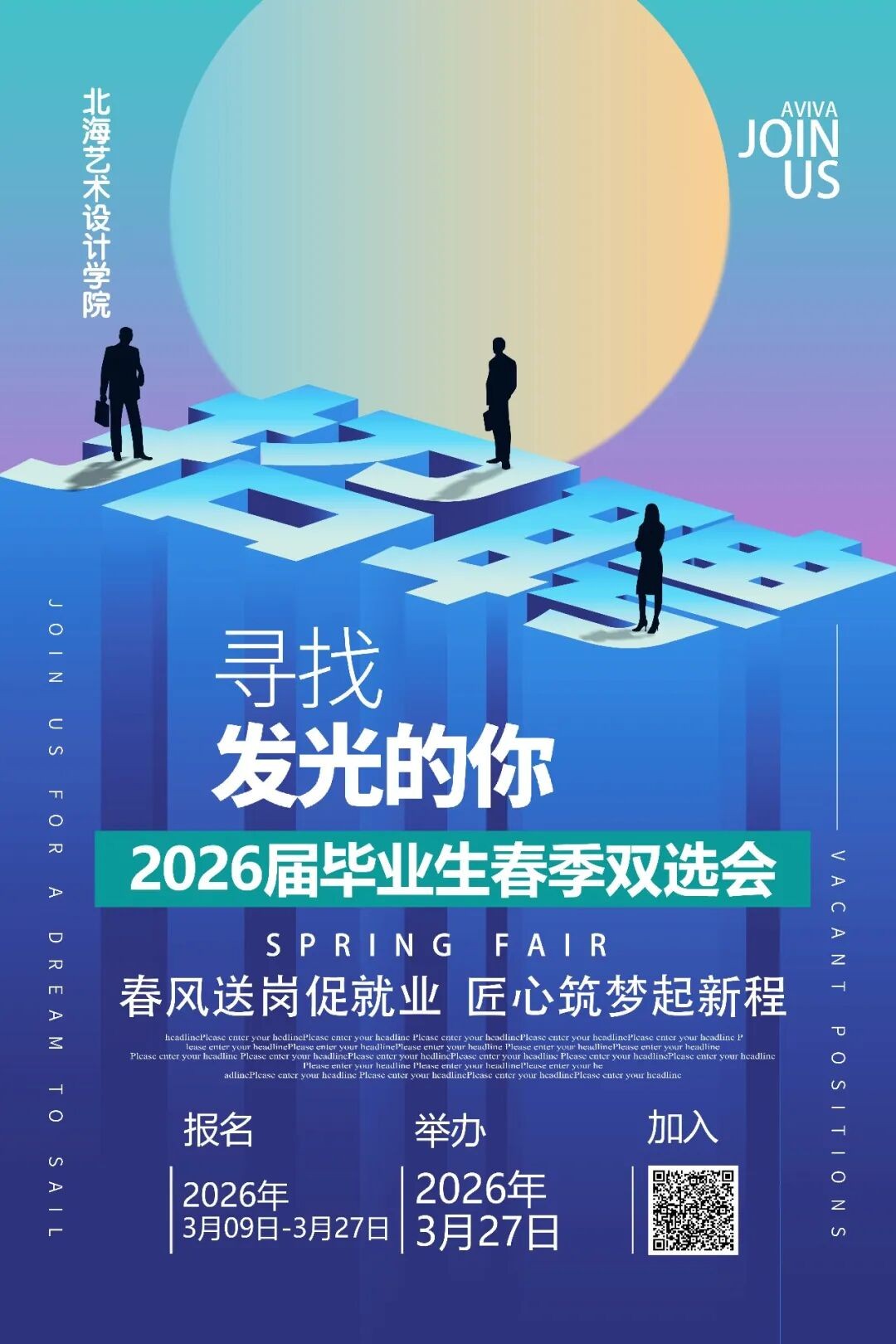 为促进我校毕业生顺利就业、尽早就业,现定于2026年3月27日于北京实践基地(北京邮电大学宏福校区、北京科技职业学院沙河校区)举办“北海艺术设计学院2026届毕业生春季双选会”(以下简称“双选会”)。诚邀各用人单位报名参加。本次双选会为公益活动,不对任何参会单位及学生收取费用,诚邀各用人单位参会选聘人才!