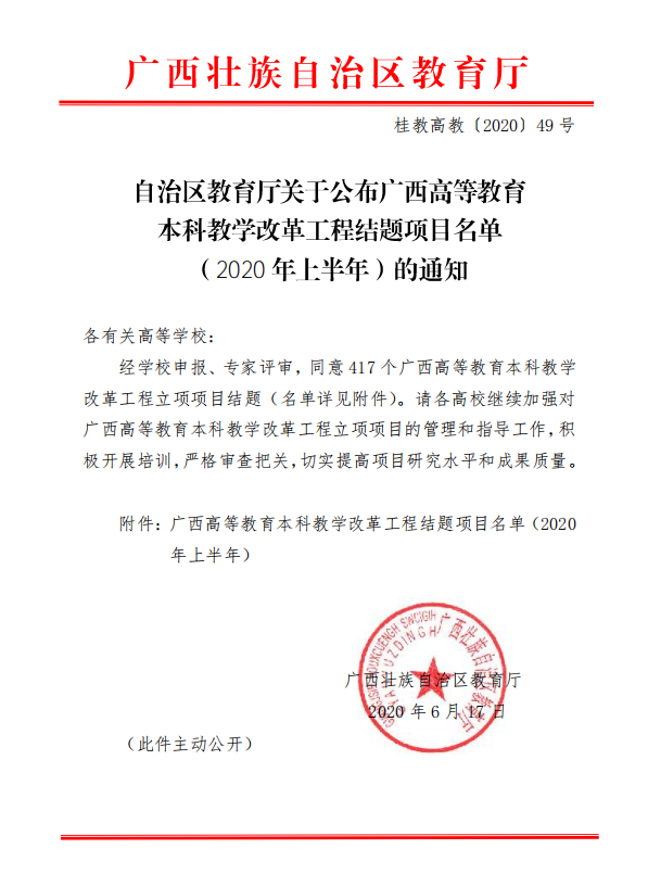 自治区教育厅关于公布2020年度 广西高等教育本科教学改革 工程项目结题工作的通知