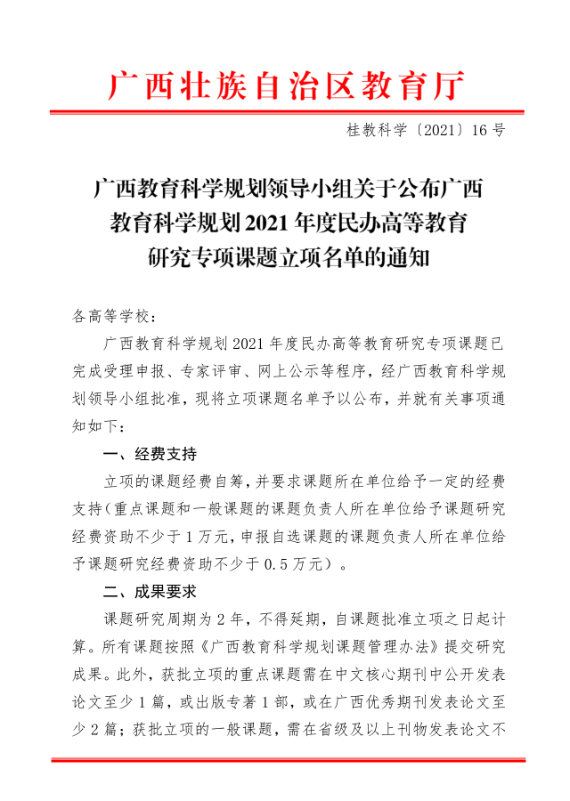 广西教育科学规划领导小组关于公布广西教育科学规划2021年度民办高等教育研究专项课题立项名单的通知