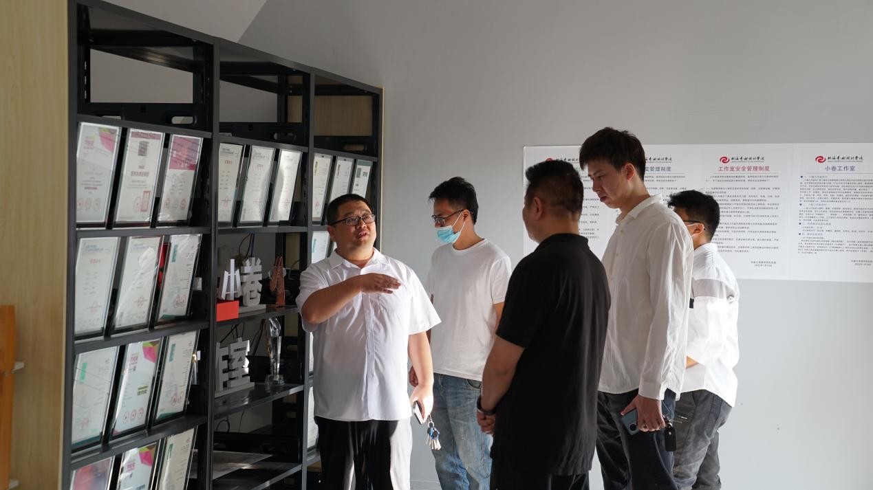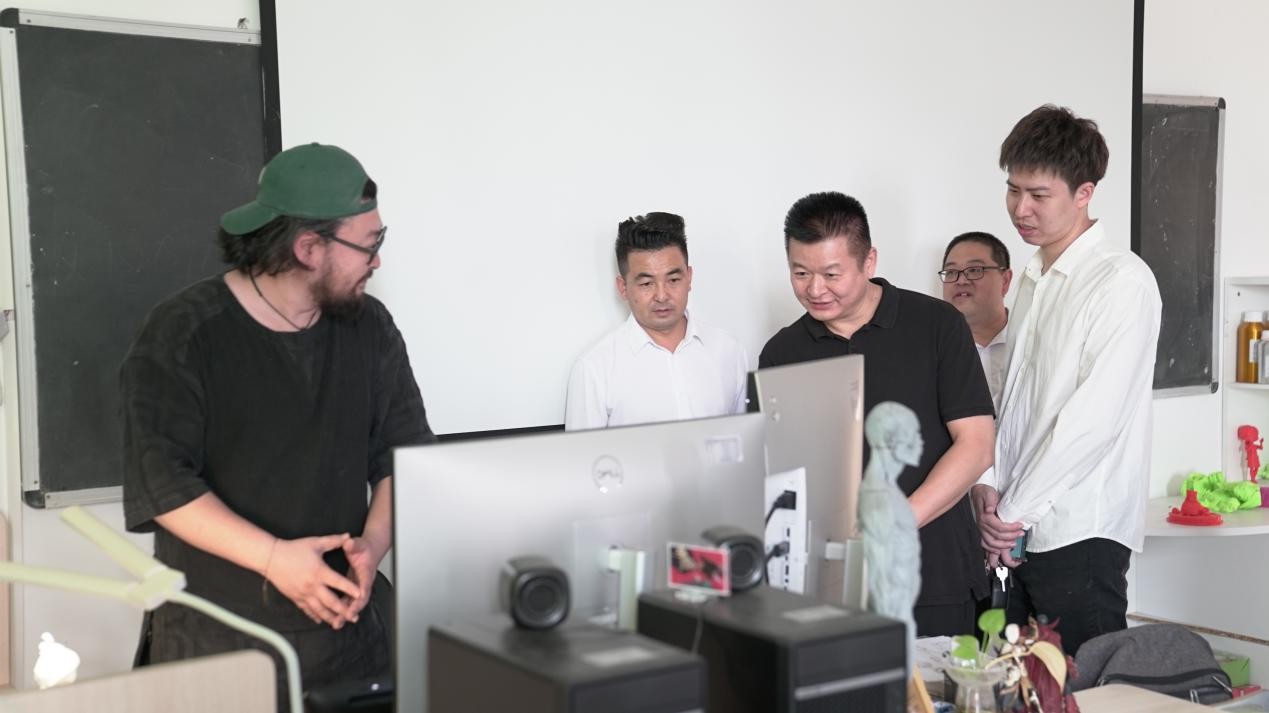 在综合楼动画实验室,孙永辉院长介绍实验室中正在参与动画项目实训的学生们的情况。在综合楼渲染实验室,刘涛主任和梁达锦副主任介绍了渲染机器设备以及正在渲染中的作品。在综合楼设备室,负责人陈蔓延老师向企业介绍和展示学院供学生实践使用的拍摄设备。在3D打印工作室,工作室负责人冯兆丹老师介绍了工作室近年来的发展成果,展示了学生优秀作品。在小卷工作室,刘涛主任介绍了教学成果及学生实践情况。随后,校企双方在综合楼演播厅观看了北海艺术设计学院宣传片。