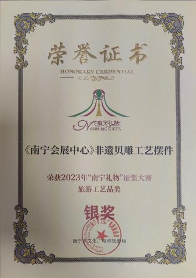 2023年作品《南宁会展中心》获2023年南宁礼物"征集大赛旅游工艺品类银奖;