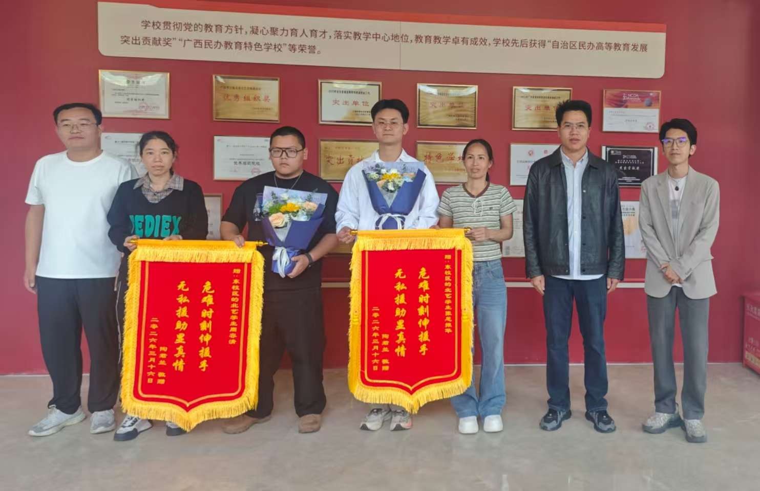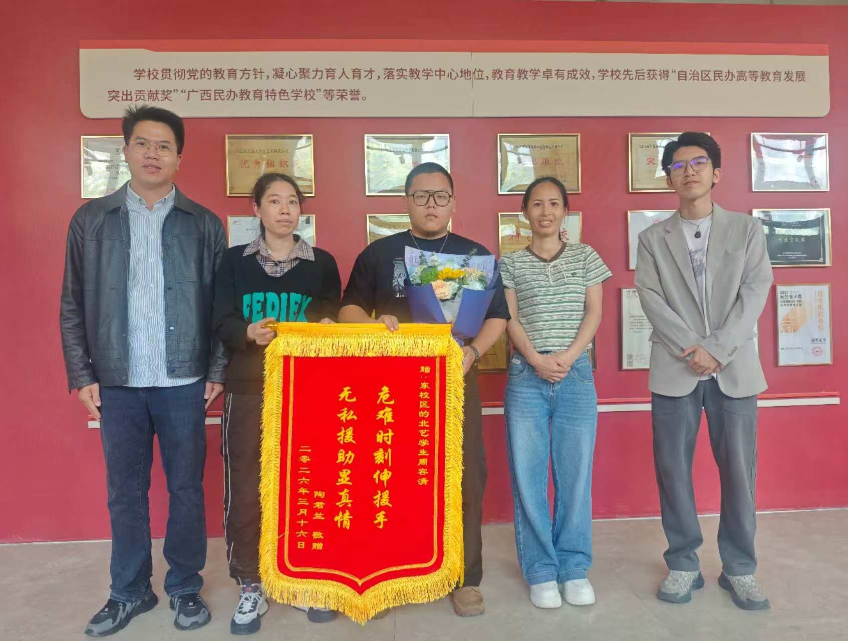 为表彰先进、弘扬正气,美术学院专门举行表彰仪式,学院副院长林昌华班级辅导员林盼鑫一同出席,被救学生家长专程到场赠送锦旗致谢。