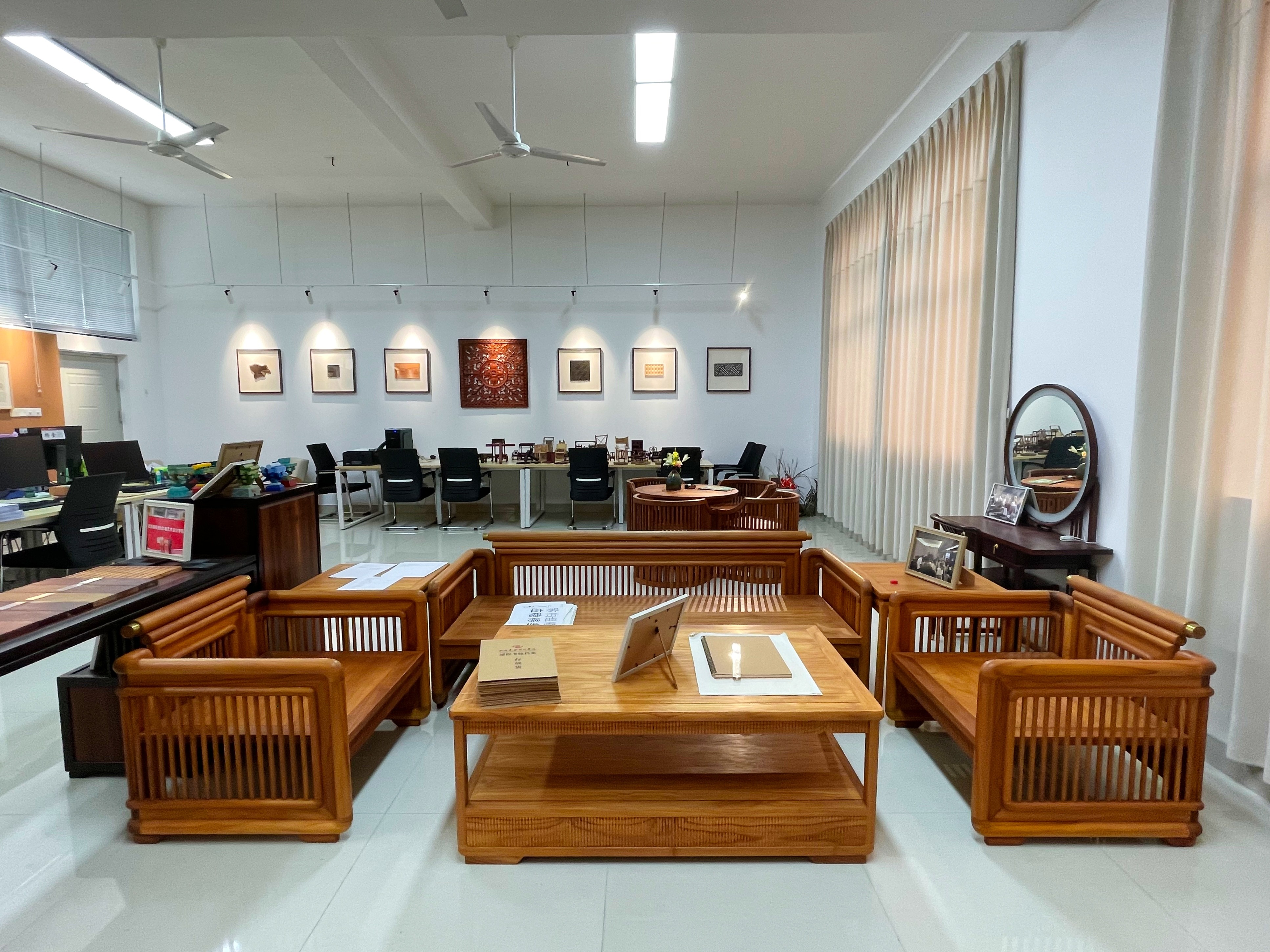 本工作室位于西校区公德楼403室,面积约130平方米,分属于建筑与环境艺术学院。工作室目前为《家具设计》课程授课教室,内设有红木家具展示区,合作洽谈区,设计工作区,工作室主要承担环境艺术专业相关课程中涉及到的实践实训任务,并组织、协调大师工作室的建设与管理,邀请行业大师来校授课、指导学生,提升学生的专业技能和职业素养。