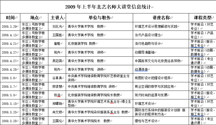 2009年上半年北艺名师大讲堂信息统计