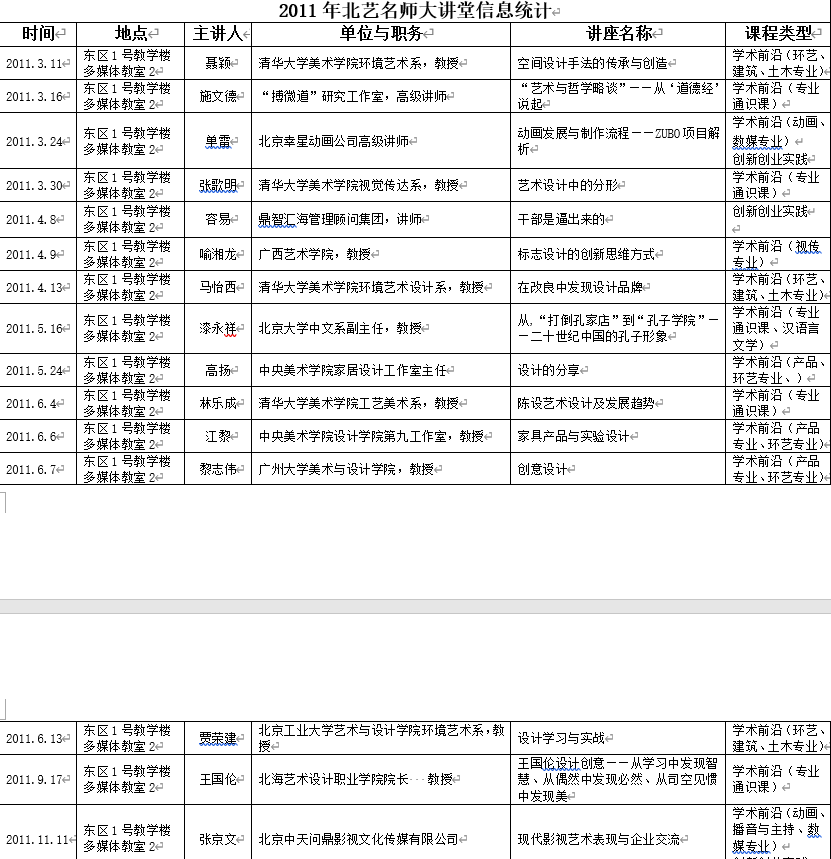 2011年北艺名师大讲堂信息统计