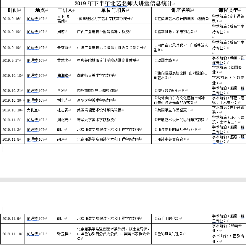 2019年下半年北艺名师大讲堂信息统计