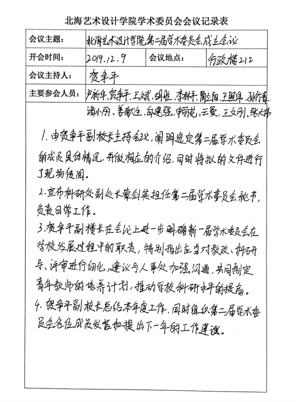 2019年12月9日,北海艺术设计学院在行政楼212召开第二届学术委员会成立会议。校长卢新华等校领导出席会议,此次会议由副校长贺争平主持。