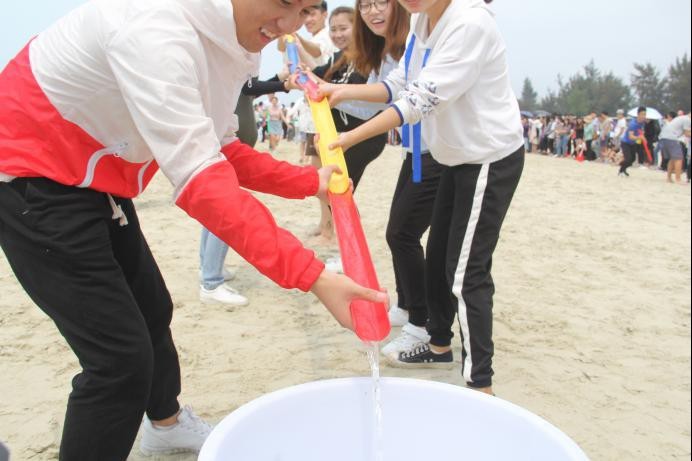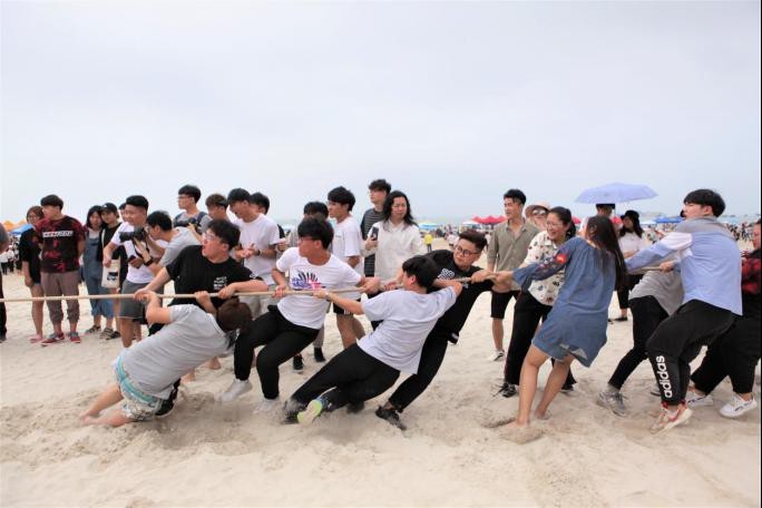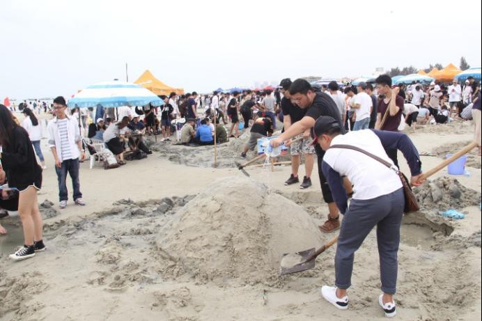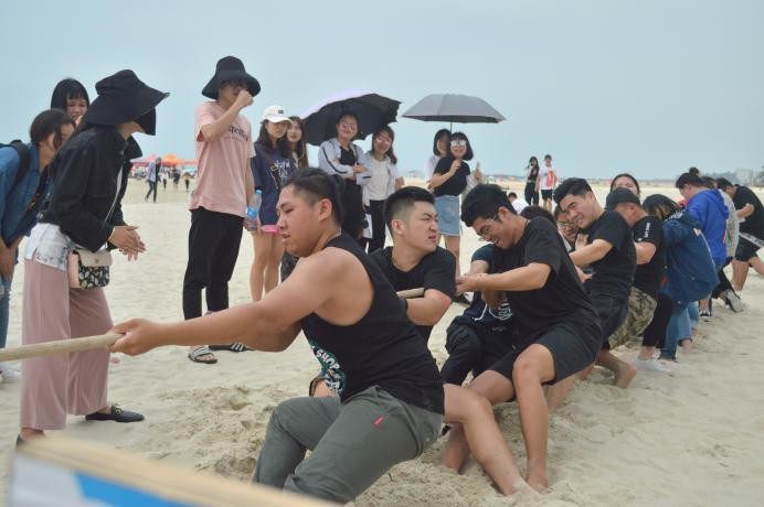 伴随着领导一声“我宣布沙滩运动会正式开始!”熙熙攘攘的人群向沙滩迅速移动。找到自己班级所在的沙雕场地,建立属于我们的大本营。搭遮阳伞,搬水,拿铁锹,大家有条不紊的忙碌着。蔚蓝的大海,金黄的沙滩,来往的游客。今日,我们便是银滩最美的风景。