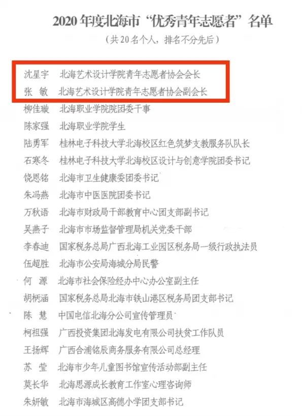 为发挥先进典型的示范引领作用,激励广大青年弘扬“奉献、友爱、互助、进步”的志愿服务精神,积极营造支持、参与、热爱志愿服务的社会文化氛围,共青团北海市委员会决定评选北海艺术设计学院青年志愿者协会等12个志愿团体为2020年度北海市“优秀青年志愿服务团体”,沈星宇等20名志愿者为2020年度北海市“优秀青年志愿者”。