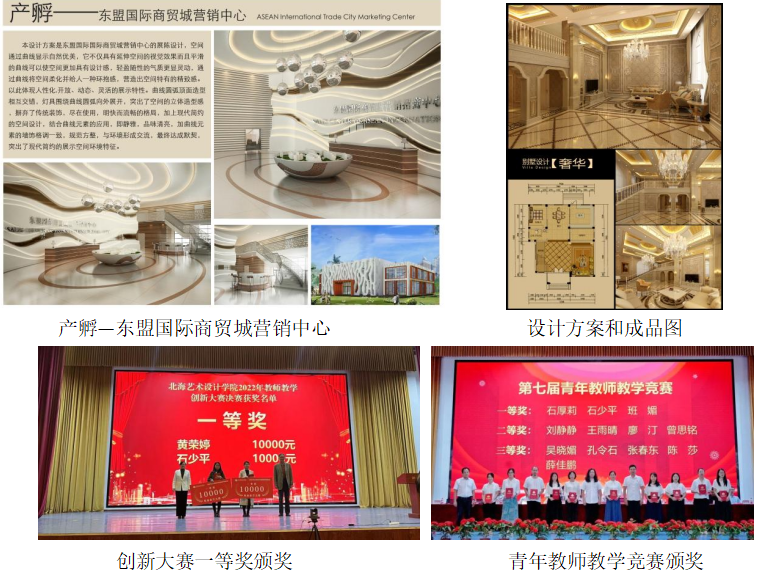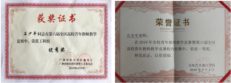 加强学习、紧跟学术前沿。在完成繁重的教科研工作之余,石少平老师积极参加各级赛事,提升个人教学水平,在2019年荣获广西壮族自治区优秀教师称号;2019年参加全区第六届青年教师教学竞赛并荣获校赛一等奖、区赛工科组优秀奖;2021年第二十届广西高校教育教学信息化大赛《展示模型制作》荣获优秀奖,校赛三等奖;2022年获广西第二届高校教师教学创新大赛校赛副高组二等奖并推送区赛;2022年获北海艺术设计学院第三届高校教师教学创新大赛校赛一等奖。
