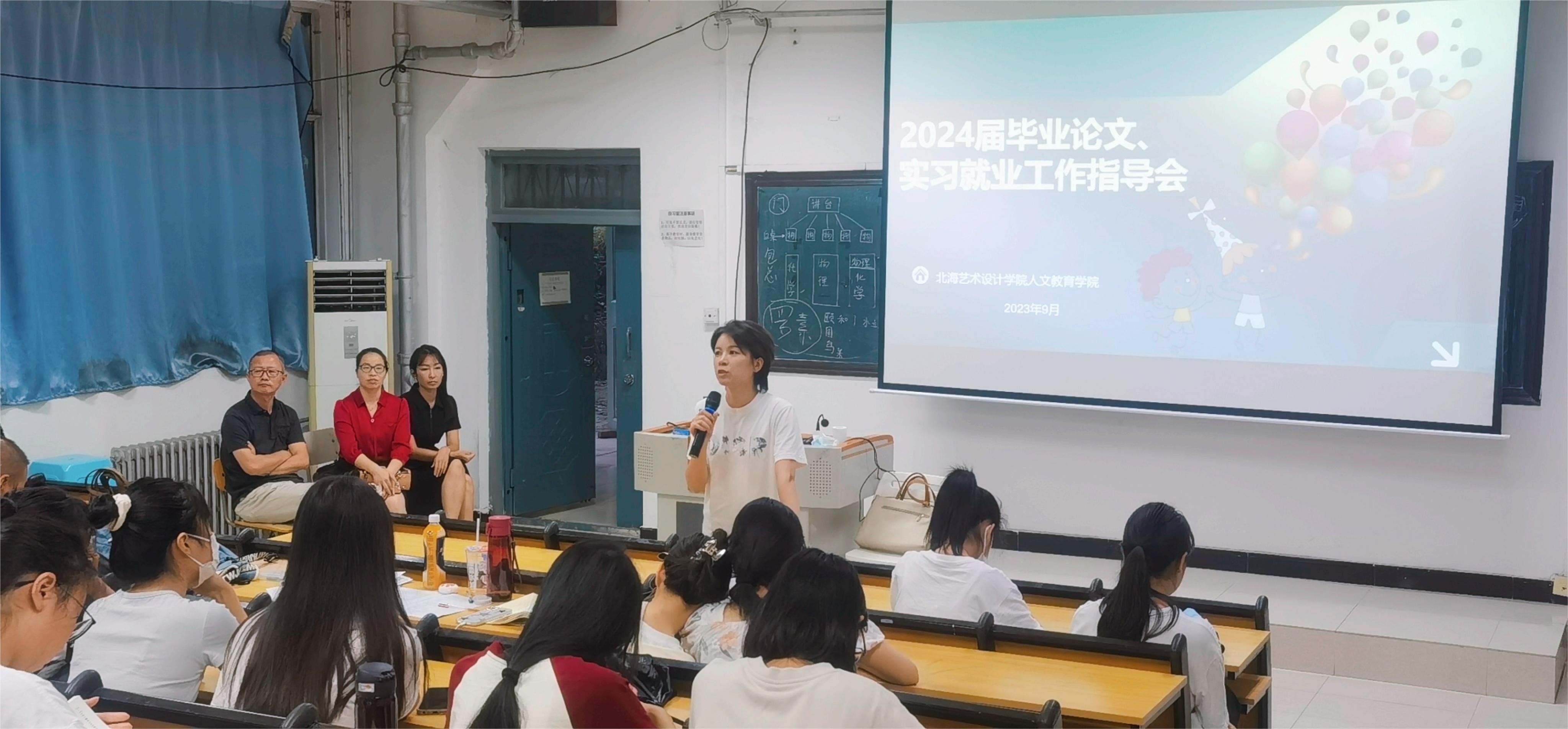 为切实做好我院2024届本科生论文指导、毕业实习与就业工作,调动学生毕业论文写作、实习与就业的积极性,9月14日,我院召开2024届毕业论文、实习就业工作动员大会。北海艺术设计学院总督学王斌、人文教育学院院长熊秀峰、副院长梁镨文出席此次动员会,人文教育学院2024届全体毕业生参加本次动员大会。会议由学院梁镨文副院长主持。